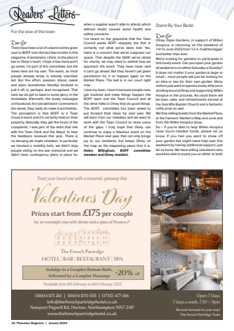 10 Phonebox Magazine | January 2025Reaff rs%u2019 Le%u001a ersFor the love of the townDear Sir There have been a lot of column inches given over to BOFF over the last few months in this magazine. A testament, I think, to the place it has in Olney%u2019s heart. I hope a few more won%u2019t go amiss. I%u2019m part of the committee, but the views here are my own. The event, as most people already know, is entirely volunteer led. But the eff ort, passion, blood, sweat and tears (sometimes literally) involved to pull it off , is, perhaps, less recognised. That said, we do get to bask in some glory. In the immediate aftermath, the lovely messages on Facebook, the %u2018job well done%u2019 comments in the street, they really do make it worthwhile.The perception is that BOFF is a Town Council event and it%u2019s certainly held on their property. Naturally, they get the brunt of the complaints. I was part of the team that met with the Town Clerk and the Mayor to hear the feedback received this year. There is no denying we made mistakes. In particular we blocked a mobility kerb, we didn%u2019t stop people sitting on the war memorial and we didn%u2019t have contingency plans in place for when a supplier wasn%u2019t able to attend, which without doubt caused some health and safety concerns.I%u2019ve heard on the grapevine that the Town Council wants BOFF stopped, but that is certainly not what we%u2019ve been told. Yes, there is a concern that we%u2019ve outgrown our space. That despite the %u00a360K we%u2019ve raised for charity, we may need to rethink how we approach the event. They have never said it can%u2019t go ahead. But they haven%u2019t yet given permission for it to happen again on the Market Place. The ball is in our court right now.I love my town. I love it because people care, get involved and make things happen: the BOFF team and the Town Council and all the other folks in Olney that do good things. The BOFF%u00a0 committee has been asked to put forward their ideas for next year. We will learn from our mistakes and we want to work with the Town Council to close some of the gaps. I truly hope that Olney can continue to enjoy a fabulous event on the Market Place next year, that not only brings joy to our residents, but keeps Olney on the map as the happening place that it is.Helen Billingham, BOFF committee member and Olney resident.Stand By Your Beds!Dear SirOlney Open Gardens, in support of Willen Hospice, is returning on the weekend of 14/15 June 2025 from 12-4. It will be bigger and better than ever.We%u2019re looking for gardens to participate in this lovely event. Can you open your garden all weekend or on either Saturday or Sunday? It does not matter if your garden is large or small %u2013 most people will just be looking for an idea or two for their own garden. Many visitors just want to spend a lovely afternoon strolling around Olney and supporting Willen Hospice in the process. As usual there will be teas, cake, and refreshments served at the Sutcliff e Baptist Church and a fantastic raffl e prize as well.We%u2019ll be selling tickets from the Market Place, at the Farmers%u2019 Market in May and June and from the Willen Hospice shop.So %u2013 if you%u2019re able to help Willen Hospice raise much-needed funds, please let us know. If you feel you want to show off your garden but might need help over this weekend by having additional support, just let us know. We have willing volunteers who would be able to assist you on either or both 01604 871 261 | 01604 870 033 | 07355 477 616info@thefrenchpartridgehotel.co.ukNewport Pagnell Rd, Horton, Northampton NN7 2APwww.thefrenchpartridgehotel.co.ukThe French PartridgeHOTEL | BAR | RESTAURANT | SPAOpen 7 Days7 days a week, 7.30 %u2013 11pmWe look forward to your stay!The French Partridge TeamTreat your loved one with a romantic getaway thisValentines DayPrices start from %u00a3175 per couplefor an overnight stay with dinner and a glass of Prosecco**Available from 8th February to 16th February 2025*20% ofi Indulge in a Couples Roman Bath, followed by a Couples Massage