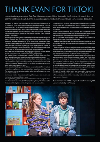 12 Phonebox Magazine | January 2025International stage sensation Dear Evan Hansen comes to Milton Keynes for the fi rst time this month. And it%u2019s also the fi rst time in the UK that the show is being performed with an ensemble, as Tom Johnston discovers.THANK EVAN FOR TIKTOK!Meet Evan: an anxious high school kid who wants nothing more than to fi t in. The thing is, on his way to fi tting in, he didn%u2019t tell the whole truth. And now must give up on a life he never dreamed he would have. It%u2019s a tough subject dealing with sensitive topics, but its stars think it has been handled beautifully.Ryan Kopel (Newsies) will play the iconic role of Evan Hansen, alongside Lauren Conroy (Into the Woods) as Zoe Murphy and Alice Fearn (Wicked) as Evan%u2019s mum, Heidi.And the big names keep coming: there%u2019s Helen Anker (Mamma Mia!) as Cynthia Murphy, Richard Hurst (The Lion King) as Larry Murphy, along with Sonny Monaghan %u2013 who was discovered on TikTok social media %u2013 as alternate Evan.The casting team collaborated with TikTok during the audition process, inviting users who were interested in being cast in the show to upload a video of themselves singing any number from it. More than 2000 videos were submitted and of those, 36 TikTok users were invited to in-person auditions. Sonny was cast in the ensemble, and as alternate Evan, performing twice a week at every matinee, as a result of the TikTok collaboration.With musical theatre credits that also includes The Book of Mormon, Ryan Kopel landed the coveted role after a three month audition process. %u201cMy agent asked me if I%u2019d be interested in Dear Evan Hansen at the start of the year,%u201d he explains. %u201cI said yes, and then did fi ve auditions, the last one being in March. A couple of days later, while on the Underground going home, my agent called to say I%u2019d got the part. %u201cI was so excited I had to get off the Tube to scream a little bit. Then I realised I was miles away from my stop and would have to walk the rest of the way. That was even more tortuous as I couldn%u2019t wait to see my family and partner%u2019s faces when I told them.%u201dSonny%u2019s way into the show was completely diff erent, and very modern and %u2018now%u2019 as far as traditional theatre goes. %u201cI saw a post asking people to submit a video of themselves singing a number from Dear Evan Hansen through TikTok,%u201d says Sonny. %u201cI sang Words Fail. Maybe three weeks later I got an email inviting me to an in-person audition. Three rounds of auditions later, Monaghan received his good news and, as it was Dear Evan Hansen that fi rst got him into musical theatre while at secondary school, he says receiving the news was %u2018a dream come true%u2019. Sonny is a self-confessed fan of the show, and fi rst saw the musical during a family holiday to New York. He loved it so much he went to see the original West End production when it opened in the UK.But for Ryan it was again a diff erent story. The actor from Kirriemuir, in Scotland, never saw the original production.%u201cBut Dear Evan Hansen was such a huge cultural phenomenon when it fi rst came out that I knew all about it without ever really knowing the story,%u201d he says. %u201cReading the script during the audition process was very helpful because as much as Ben Platt, the original Evan, was iconic in the role, it was nice to be able to form my own take on Evan. The writing is so good that I really can just trust my instinct to bring what I feel to the character. %u201cUsually when you do a musical that has been done before, there%u2019s a set way of doing everything; %u2018This is how you say this line,%u2019 and %u2018This is where you stand on the stage for this moment%u2019. We%u2019ve had none of that. We have complete freedom to take the script and create something new.%u201dThe production has partnered with The Mix, the UK%u2019s leading digital charity for under 25-year-olds. As the show deals with sensitive topics relevant to young people, this partnership will ensure that anyone aff ected by the issues explored in the show knows where to fi nd support. The Mix will provide training to the cast and creative team on how to appropriately respond to queries from the public, both online and offl ine, and equip them with the knowledge to direct individuals to the right support channels. Dear Evan Hansen is at Milton Keynes Theatre from Tuesday 28th January to Saturday 1st February.