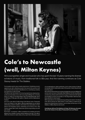 14 Phonebox Magazine | January 2025He%u2019s a songwriter, singer and musician who has spent the last 10 years roaming the diverse echelons of music, from traditional folk to 80s pop. And the roaming continues as Cole Stacey heads for The Stables.Cole%u2019s to Newcastle (well, Milton Keynes)From spoken word to new romantic electronics. Combining concert appearances with collecting sounds from around the world as half of alternative folk sensation India Electric Co., Cole Stacey certainly has experience under his belt.The Devon man has drawn on his touring experiences playing bass, synths and mandolin on tour with music legend Midge Ure, including being on stage at The Royal Albert Hall, the Westfalenhalle Arena in Germany, a 700-year-old castle in Gdansk and the Glastonbury Festival.And now a new album fi nally brings Cole Stacey home. %u2018Postcards From Lost Places%u2019 is the debut, off ering regeneration as its theme while being rooted in tradition. At its heart is an association of %u2018lost%u2019 places and forgotten words, stretching as far back as the 13th century, paired with Cole%u2019s distinctive lyrical song writing and soft pop vocals. Each track %u2013 or postcard %u2013 off ers a snapshot of a creative soul and a glimpse into a wealth of audio stories waiting to be told. This album off ers the chance to read a diary entry, says Cole, refl ecting a goal of not attempting to attain perfection, but to share stories of places and people with an alternative view of the world, of who they are and how they see it.Since 2015 Cole has been accompanying legendary pop icon Midge Ure across sold-out tours of Australia, New Zealand, the UK, Scandinavia and Germany. Shows with the Human League at Hammersmith Apollo and headline concerts at the likes of The Royal Albert Hall have also been plentiful in recent years.With explorations into traditional song writing and verse in his blood, Cole will be sharing his debut album in early 2025 to audiences far beyond his Dartmoorian horizons. And he kicks off the tour at The Stables, in Milton Keynes next month. Cole Stacey will be at The Stables on Friday 7th February, the same day as the release of his album %u2018Postcards From Lost Places%u2019.