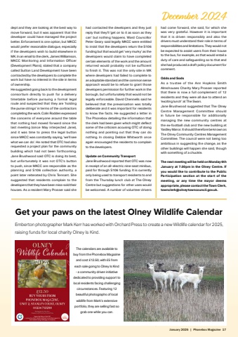 January 2025 | Phonebox Magazine 17December 2024dept and they are looking at the best way to move forward, but it was apparent that the developer could have managed the project better. Enforcement is one option, but MKCC would prefer reasonable dialogue, especially if the developers wish to build elsewhere in MK. In an email to the clerk, James Williamson, MKCC Monitoring and Information Officer (Development Plans), stated that a company called Sutton Land Development have been contracted by the developers to complete the work but have no interest in the site in terms of ownership. He suggested going back to the development consortium directly to push for a delivery timetable before pursuing a formal legal route and suspected that they are %u2019holding the purse strings%u2019 in terms of the contractors completing the work. Colin Rodden expressed the concerns of everyone around the table that nothing had moved forward since the last meeting (since May interjected Jane), and it was time to press the legal button since MKCC was constantly saying, %u2018we%u2019ll see what we can do%u2019. He noted that OTC had also requested a project plan for the community building which had not been forthcoming. Jane Brushwood said OTC is doing its best, but unfortunately it was not OTC%u2019s button to push, since MKCC are responsible as the planning and S106 collection authority, a point later reiterated by Chris Tennant. She suggested that residents complain to the developers that they have been miss-sold their houses. As a resident Mary Prosser said she had contacted the developers and they just reply that they%u2019ll %u2018get on to it as soon as they can%u2019 but nothing happens. Ward Councillor Peter Geary said legally MKCC were entitled to insist that the developers return the S106 funding but that would get %u2018very murky%u2019 as the developers would claim to have completed certain elements of the work and the amount returned would probably not be sufficient to fi nish it. This was not the only site in MK where developers had failed to complete to an adoptable standard and the common sense approach would be to refuse to grant those developers permission for further work in the borough, but unfortunately that would not be legally enforceable. David Chennells said he believed that the prevarication was totally deliberate and it was important for residents to know the facts. He suggested a letter in The Phonebox detailing the information that the clerk had been given which might defl ect some of the criticism accusing OTC of doing nothing and pointing out that they can do nothing. In closing Debbie Whitworth once again encouraged the residents to complain to the developers.Update on Community TransportJane Brushwood reported that OTC was now in receipt of an all-electric nine-seat minibus, paid for through S106 funding. It is currently only being used to transport residents to and from the Thursday lunch club at The Olney Centre but suggestions for other uses would be welcomed. A number of volunteer drivers had come forward, she said, for which she was very grateful. However it is important that it is driven responsibly and also the drivers must understand their role in terms of responsibilities and limitations. They would not be expected to assist users from their house to the bus, for example, as that would entail a duty of care and safeguarding so to that end she had produced a draft policy document for comment.Odds and SodsAs a trustee of the Ann Hopkins Smith Almshouses Charity Mary Prosser reported that there is now a full complement of 12 residents and they were all due to attend an %u2018exciting lunch%u2019 at The Swan.Jane Brushwood suggested that The Olney Centre Management Committee should in future be responsible for additionally managing the new community centres at the ex-football club and the new building at Yardley Manor. It should therefore be known as The Olney Community Centres Management Committee. The council were not being too ambitious in suggesting the change, as the other buildings will happen she said, though with something of a chuckle. The next meeting will be held on Monday 6th January at 7.00pm in the Olney Centre. If you would like to contribute to the Public Participation section at the start of the meeting, or any time the mayor deems appropriate, please contact the Town Clerk, townclerk@olneytowncouncil.gov.uk.Get your paws on the latest Olney Wildlife CalendarEmberton photographer Mark Kerr has worked with Orchard Press to create a new Wildlife calendar for 2025, raising funds for local charity Olney Is Kind.The calendars are available to buy from the Phonebox Magazine and cost %u00a312.50, with %u00a35 from each sale going to Olney Is Kind - a community driven initiative dedicated to providing support to local residents facing challenging circumstances. Featuring 12 beautiful photographs of local wildlife from Mark%u2019s extensive portfolio, they are selling fast so grab one while you can.
