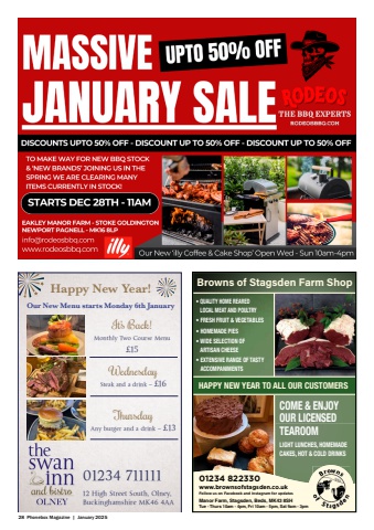 28 Phonebox Magazine | January 202501234 822330www.brownsofstagsden.co.ukFollow us on Facebook and Instagram for updatesManor Farm, Stagsden, Beds, MK43 8SHTue - Thurs 10am - 4pm, Fri 10am - 5pm, Sat 9am - 3pmBrowns of Stagsden Farm ShopCOME & ENJOY OUR LICENSED TEAROOMLIGHT LUNCHES, HOMEMADE CAKES, HOT & COLD DRINKS%u2022 QUALITY HOME REARED LOCAL MEAT AND POULTRY%u2022 FRESH FRUIT & VEGETABLES %u2022 HOMEMADE PIES%u2022 WIDE SELECTION OF ARTISAN CHEESE%u2022 EXTENSIVE RANGE OF TASTY ACCOMPANIMENTS HAPPY NEW YEAR TO ALL OUR CUSTOMERS12 High Street South, Olney, Buckinghamshire MK46 4AA01234 711111ThursdayAny burger and a drink %u2013 %u00a313WednesdaySteak and a drink %u2013 %u00a316Happy New Year!Our New Menu starts Monday 6th JanuaryIt%u2019s Back!Monthly Two Course Menu %u00a315