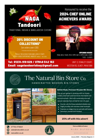 January 2025 | Phonebox Magazine 3Tel: 01234 918 629 / 07946 542 162 Email: nagatandooriolney@gmail.comUNIT 3, STANLEY COURT, WESTON RD, OLNEY, MK46 5NHTandooriNAGATandooriNAGAOPENING HOURSMON, WED, THUR, FRI 5-11PM | SAT 3-11PM | SUN 3-10PMTUES - CLOSEDTRADITIONAL INDIAN & BANGLADESHI CUISINE* Promotion ends 31st January 202520% DISCOUNT ON COLLECTIONS* (on orders over %u00a330)Honoured to receive the 2024 CHEF ONLINE ACHIEVERS AWARD%u201cREALLY DELICIOUS FOOD AND LOVELY STAFF. A VERY GOOD EXPERIENCE INDEED%u201d GOOGLE - DEC 2024One bin unit fits three individual wheelie binsHighly durable with stainless steel hardwareFeatures an elegant barrel roof with wild sedumDelivered, planted and installedBritish Made, Premium Wooden Bin StoresTidy up your garden or driveway with our locallycrafted, solid hard wood bin stores that blends intothe environment. Built with sustainably sourced,natural materials that will last for over 25 years.07706 470869sales@naturalbin.co.uknaturalbin.co.uk25% off with this advert!This is an MDBI Ltd Product: