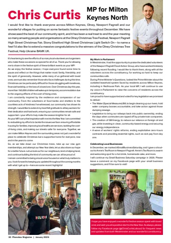 30 Phonebox Magazine | January 2025I would fi rst like to thank everyone across Milton Keynes, Olney, Newport Pagnell and our wonderful villages for putting on some fantastic festive events throughout December. We have showcased the best of our community spirit, and it has been a real treat to end the year meeting so many amazing people and organisations at the Olney Christmas Tree Festival, Newport Pagnell High Street Christmas Fair, Stony Stratford High Street Christmas Light Switch On %u2013 to name a few! I%u2019d also like to extend a massive congratulations to the winners of the Olney Christmas Tree Festival, Help Ukraine BAMK UK.It%u2019s heartening to see the eff orts of so many local volunteers and organisers who make these occasions so special for all of us. Thank you for allowing me to share in the festive spirit of these brilliant events as your MP!As we enjoy the festive season, I hope everyone found some time to pause and refl ect on the things that matter most: family, friendship, and the spirit of generosity. However, while many of us gathered with loved ones, we must also remember those who face challenges during this time. Christmas can be particularly diffi cult for those struggling with loneliness, fi nancial hardship, or the loss of a loved one. Over Christmas day this year, more than 150,000 children will wake up in temporary accommodation due to the ongoing eff ects of the cost-of-living crisis.I am constantly inspired by the resilience and compassion of our community. From the volunteers at food banks and shelters to the countless acts of kindness I%u2019ve witnessed, our community has shown its strength. I would like to extend my heartfelt gratitude to all key workers for their dedication and hard work, ensuring our communities remain safe and supported%u2014your eff orts truly make the season brighter for all.As your MP, I carry that inspiration with me into the New Year. I am committed to redoubling my eff orts to tackle the issues we face: ensuring aff ordable housing for families, improving local healthcare services, tackling the costof-living crisis, and making our streets safer for everyone. Together, we can make Milton Keynes and the surrounding areas not just a wonderful place to celebrate Christmas but a supportive home for everyone, now and in the years to come.So, as we take down our Christmas trees, take up our new gym memberships, and attempt our New Year diets, let us also share our hope for a better future. Let us look out for our neighbours, lend a helping hand, and continue building the kind of community we can all be proud of.I remain committed to being a local voice focused on what truly matters to you. I look forward to keeping you updated throughout the coming months with what I get up to%u2014here are some recent highlights!Chris Curtis MP for MiltonKeynes NorthMy Work in ParliamentIn Westminster, I had the opportunity to praise the dedicated volunteers of the Newport Pagnell Flood Action Group, who have worked tirelessly following recent fl ooding. I would like to thank them, along with all the volunteers across the constituency, for working so hard to keep our communities safe.During Prime Minister%u2019s Questions, I asked the Prime Minister about the outdated leasehold system faced by residents across Milton Keynes, including in Redhouse Park. As your local MP, I will continue to use my voice in Parliament to raise the concerns of residents across the constituency.I am proud to have supported and voted for key legislation we promised to deliver:%u2022%u2002 The Water (Special Measures) Bill, to begin cleaning up our rivers, hold water company bosses accountable, and take action against those dumping sewage.%u2022%u2002 Legislation to bring our railways back into public ownership, ending the days when commuters are ripped off by private train companies.%u2022%u2002 The creation of GB Energy, to reduce our reliance on foreign oil and gas, while investing in clean, community-based energy and securing our energy independence.%u2022%u2002 A wave of workers%u2019 rights reforms, ending exploitative zero-hours contracts and providing essential rights, such as sick pay from day one.Celebrating Local BusinessesIn December, we marked #SmallBusinessSaturday, and I gave a shoutout to Annie%u2019s Tea Room in Newport Pagnell. Annie%u2019s Tea Room is a warm and welcoming spot for a hot drink, homemade cake, and more.I will continue my Small Business Saturday campaign in 2025. Please leave a comment on my Facebook page with your small business suggestions, and I%u2019ll be sure to visit!I hope you have enjoyed a wonderful festive season spent with loved ones and wish you all a positive start to the New Year. As always, please follow my Facebook page (@ChrisCurtisLabour) for frequent news and updates from both Westminster and our wonderful constituency.