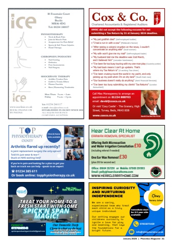 January 2025 | Phonebox Magazine 31Cox & Co.Chartered Accountants & Registered Auditors%u2022 %u201cMy pet goldfish died%u201d (Self-employed builder)%u2022 %u201cI had a run-in with a cow%u201d (Midlands%u2019s farmer)%u2022 %u201cAfter seeing a volcanic eruption on the news, I couldn%u2019t concentrate on anything else%u201d (local woman)%u2022 %u201cMy wife won%u2019t give me my mail%u201d (Self-employed trader)%u2022 %u201cMy husband told me the deadline was 31st March, and I believed him%u201d (Leicester hairdresser)%u2022 %u201cI%u2019ve been far too busy touring with my one-man play (Coventry writer)%u2022 %u201cMy bad back means I can%u2019t go upstairs. That%u2019s where my Tax Return is%u201d (A working Taxi driver)%u2022 %u201cI%u2019ve been cruising round the world in my yacht, and only picking up my post when I%u2019m on dry land%u201d (South East man)%u2022 %u201cOur business doesn%u2019t really do anything%u201d (Kent Financial Services)%u2022 %u201cI%u2019ve been too busy submitting my clients%u2019 Tax Returns%u201d (London Accountant)David Cox BA FCA FCCACall Miss Moneypenny to arrange an appointment on 01234 888703email: david@coxco.co.ukOr visit %u2018Coxy Castle%u2019 - The Granary, High Street, Turvey, Beds, MK43 8DBHMRC did not accept the following excuses for not submitting a Tax Return by 31 st January 2024 deadline.www.coxco.co.uk PHYSIOTHERAPY%u2022 Neck & Back Pain%u2022 Joint & Muscle Pain%u2022 Acupuncture for Pain Relief%u2022 Sports & Soft Tissue Injuries%u2022 Hand TherapyCHIROPODY/PODIATRY%u2022 Nail Cutting%u2022 Orthotics%u2022 Foot Assessments%u2022 Nail SurgerySHOCKWAVE THERAPY%u2022 Achilles Tendon Pain%u2022 Golfer%u2019s/Tennis Elbow%u2022 Plantar Fasciitis%u2022 Knee/Hamstring Tendonitis Mon-Thurs 9 a.m. %u2013 Late. Friday 9 a.m. %u2013 3 p.m. Tel: 01234 240117 e-mail: olney@iceclinic.co.uk ESTABLISHED IN OLNEY SINCE 2010 ALL MAJOR INSURANCE COMPANIES ACCEPTED. www.iceclinic.co.ukBOOK ONLINE OR BY PHONE10 Fountain CourtOlneyBucksMK46 4DGTel: 01234 240117INSPIRING CURIOSITY AND NURTURING INDEPENDENCEWe are a caring, experienced team who treat each child as a truly unique individual Our setting engages our childrens curiosity to ignite a love for play and learning, that lays the foundations for a bright future. info@olneynursery.co.uk07855075420Immediate start for 2-3 year olds availableWWW.HEARCLEARATHOME.COMOffice: 01604 357291 or Mobile: 07909 291993Email: polly@hearclearathome.comHear Clear At HomeEARWAX REMOVAL SPECIALISTOffering Both Microsuction and Water Irrigation Consultation %u00a310(including referral if needed)One Ear Wax Removal %u00a330(plus %u00a310 for second ear)TREAT YOUR HOME TO AFRESH START WITH SOMETREAT YOUR HOME TO AFRESH START WITH SOME0077337766886655334433 spicknspancleaningservicesltd@gmail.com T R A N S F O R M I N G E V E R YC O R N E R O F Y O U R H O M E I N T OA S P A R K L I N G H A V E NT R A N S F O R M I N G E V E R YC O R N E R O F Y O U R H O M E I N T OA S P A R K L I N G H A V E NArthritis flared up recently?%uf028 01234 385 611 Or book online: topphysiotherapy.co.ukIf you%u2019re in pain and looking for a plan to get you back on track we can help - speak to an expertClinic & Home visits availableIs joint replacement surgery the only option?Told it%u2019s just wear & tear?Stuck on NHS waiting lists?