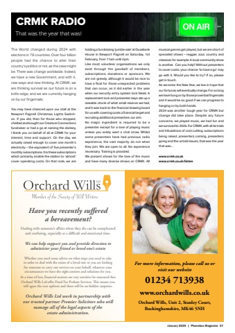 January 2025 | Phonebox Magazine 37The World changed during 2024 with elections in 76 countries. Over four billion people had the chance to alter their country%u2019s politics or not, as the case might be. There was change worldwide. Indeed, we have a new Government, and with it, new ways and new thinking. At CRMK, we are thinking survival as our future is on a knife-edge, and we are currently hanging on by our fi ngernails.You may have chanced upon our stall at the Newport Pagnell Christmas Lights Switchon. If you did, then for those who stopped, chatted and bought our Creature Connections fundraiser or had a go at naming the donkey, I thank you on behalf of all at CRMK for your interest, time and support. On the day, we actually raised enough to cover one month%u2019s electricity %u2013 the equivalent of fi ve presenter%u2019s monthly subscriptions. It is these subscriptions which primarily, enable the station to %u2018almost%u2019 cover operating costs. On that note, we are holding a fundraising %u2018jumble sale%u2019 at Ousebank House in Newport Pagnell on Saturday, 1st February, from 11am until 4pm.Like most volunteer organisations we only exist through the goodwill of members, subscriptions, donations or sponsors. We are not greedy, although it would be nice to have a fl oat for those unexpected problems that can occur, as it did earlier in the year when our security entry system lock failed. A replacement lock and presenter keys ate up a sizeable chunk of what small reserve we had, and it was back to the fi nancial drawing board for us with covering costs a fi nancial target and recruiting additional presenters our aim. No magic ingredient is required to be a presenter except for a love of playing music unless you solely want a chat show. Whilst some presenters have had previous radio experience, the vast majority do not when they join. We are open to all. No experience necessary. Training is provided. We present shows for the love of the music and have many diverse shows on CRMK. All musical genres get played, but we are short of specialist shows %u2013 reggae, soul, country and classical, for example. A local community show is another. Can you help? Without presenters to cover costs, your chance %u2018to have a go%u2019 may go with it. Would you like to try? If so, please get in touch. As we enter the New Year, we live in hope that our fortunes will eventually change. For so long we have hung on by those proverbial fi ngernails and it would be so good if we can progress to hanging on by both hands.2024 was another tough year for CRMK but change did take place. Despite any future concerns, we played music, we had fun and we survived to 2025. For CRMK, with all its trials and tribulations of cost cutting, subscriptions being raised, presenters coming, presenters going and the untold issues, that was the year that was...www.crmk.co.ukwww.crmk.co.uk/listenThat was the year that was!CRMK RADIOHave you recently sufi ered a bereavement?Dealing with someone%u2019s afi airs when they die can be complicated and confusing, especially at a diff cult and emotional time.We can help support you and provide direction to administer your friend or loved one%u2019s estateWhether you need some advice on what steps you need to take in order to deal with the estate of a loved one or you are looking for someone to carry out services on your behalf, whatever your circumstances we have the right answers and solutions for you.At a time of loss, ffl nancial matters are very sensitive be reassured that Orchard Wills Ltd ofi er Fixed Fee Probate Services. ffi is means you will agree the cost upfront and there will be no hidden surprises.Orchard Wills Ltd work in partnership with our trusted partner Premier Solicitors who will manage all of the legal aspects of the estate administration.For more information, please call us or visit our website 01234 713938www.orchardwills.co.ukOrchard Wills, Unit 2, Stanley Court, Buckinghamshire, MK46 5NH