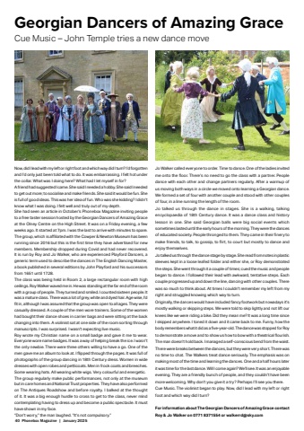 40 Phonebox Magazine | January 2025Georgian Dancers of Amazing Grace Cue Music %u2013 John Temple tries a new dance moveNow, did I lead with my left or right foot and which way did I turn? I%u2019d forgotten and I%u2019d only just been told what to do. It was embarrassing. I felt hot under the collar. What was I doing here? What had I let myself in for? A friend had suggested I came. She said I needed a hobby. She said I needed to get out more; to socialise and make friends. She said it would be fun. She is full of good ideas. This was her idea of fun. Who was she kidding? I didn%u2019t know what I was doing. I felt well and truly out of my depth. She had seen an article in October%u2019s Phonebox Magazine inviting people to a free taster session hosted by the Georgian Dancers of Amazing Grace at the Olney Centre on the High Street. It was on a Friday evening, a few weeks ago. It started at 7pm. I was the last to arrive with minutes to spare. The group, which is affi liated with the Cowper & Newton Museum has been running since 2016 but this is the fi rst time they have advertised for new members. Membership dropped during Covid and had never recovered. It is run by Roy and Jo Walker, who are experienced Playford Dancers, a generic term used to describe the dances in The English Dancing Master, a book published in several editions by John Playford and his successors from 1651 until 1728. The class was being held in Room 2, a large rectangular room with high ceilings. Roy Walker waved me in. He was standing at the far end of the room with a group of people. They turned and smiled. I counted sixteen people. It was a mature class. There was a lot of grey, white and dyed hair. Age wise, I%u2019d fi t in, although I was assured that the group was open to all ages. They were casually dressed. A couple of the men wore trainers. Some of the women had bought their dance shoes in carrier bags and were sitting at the back changing into them. A violinist sat at one side of the room sorting through manuscripts. I was surprised. I wasn%u2019t expecting live music. Roy wrote my Christian name on a small badge and gave it me to wear. Everyone wore name badges. It was a way of helping break the ice. I wasn%u2019t the only newbie. There were three others willing to have a go. One of the men gave me an album to look at. I fl ipped through the pages. It was full of photographs of the group dancing in 18th Century dress. Women in wide dresses with open robes and petticoats. Men in frock coats and breeches. Some wearing hats. All wearing white wigs. Very colourful and energetic. The group regularly make public performances, not only at the museum but in care homes and National Trust properties. They have also performed on The Antiques Roadshow and before royalty. I balked at the thought of it. It was a big enough hurdle to cross to get to the class, never mind contemplating having to dress up and become a public spectacle. It must have shown in my face. %u201cDon%u2019t worry,%u201d the man laughed. %u201cIt%u2019s not compulsory.%u201d Jo Walker called everyone to order. Time to dance. One of the ladies invited me onto the fl oor. There%u2019s no need to go the class with a partner. People dance with each other and change partners regularly. After a warmup of us moving both ways in a circle we moved onto learning a Georgian dance. We formed a set of four with another couple and stood with other couples of four, in a line running the length of the room. Jo talked us through the dance in stages. She is a walking, talking encyclopaedia of 18th Century dance. It was a dance class and history lesson in one. She said Georgian balls were big social events which sometimes lasted until the early hours of the morning. They were the dances of educated society. People thronged to them. They came in their fi nery to make friends, to talk, to gossip, to fl irt, to court but mostly to dance and enjoy themselves. Jo talked us through the dance stage by stage. She read from notes in plastic sleeves kept in a loose leafed folder and either she, or Roy demonstrated the steps. She went through it a couple of times; cued the music and people began to dance. I followed their lead with awkward, tentative steps. Each couple progressed up and down the line, dancing with other couples. There was so much to think about. At times I couldn%u2019t remember my left from my right and struggled knowing which way to turn. Originally, the dances would have included fancy footwork but nowadays it%u2019s mostly walking or skipping steps. We were told to skip lightly and not lift our knees like we were riding a bike. Did they mean me? It was a long time since I skipped anywhere. I toned it down and it came back to me. Funny, how the body remembers what it did as a fi ve-year-old. The dance was stopped for Roy to demonstrate a move and to show us how to bow with a theatrical fl ourish. The man doesn%u2019t hold back. I managed a self-conscious bend from the waist. There were breaks between the dances, but they were very short. There was no time to chat. The Walkers treat dance seriously. The emphasis was on making most of the time and learning the dances. One and a half hours later it was time for the last dance. Will I come again? We%u2019ll see. It was an enjoyable evening. They are a friendly bunch of people, and they couldn%u2019t have been more welcoming. Why don%u2019t you give it a try? Perhaps I%u2019ll see you there. Cue Music. The violinist began to play. Now, did I lead with my left or right foot and which way did I turn? For information about The Georgian Dancers of Amazing Grace contact Roy & Jo Walker on 0771 8371554 or walkerrd@sky.com