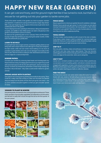 44 Phonebox Magazine | January 2025HAPPY NEW REAR (GARDEN)It can get cold and frosty, and the ground might feel like it has turned to rock, but that%u2019s no excuse for not getting out into your garden to tackle some jobs.Think of the winter months in the garden as a time to prepare, maintain and replenish, in readiness for spring and the warmer, longer days ahead. With a new year beginning, it%u2019s as good a time as any to get some much needed jobs done in the garden.There%u2019s tidying to be done, planting to think about, raking and preparation to tackle, and wildlife to feed. While winter can seem a bit gloomy in the garden it should still be a period of activity.So what are the gardening jobs to do in January? Here are Phonebox%u2019s top tips of tasks that will keep you busy during the winter months. A little work now will benefi t you greatly later.LAWN TO BE WILDIt could well have had a tough summer, in between getting dried out and being well used in equal measure and, although it%u2019s hardy and evergreen, the lawn needs a little rest over winter. Avoid walking on it as much as possible as grass blades and roots can be damaged more easily at this time of year. Give the surface a raking to clear dead leaves and moss and trim the edges for a neat and tidy fi nish.BORDER PATROLCut back your borders by removing dead heads and trimming back any fl owers that look messy. As foliage gets thinned out you might fi nd yourself with some bare space to fi ll. Do this with wall fl owers, which are hardy and strong. Cut back any herbaceous perennials to keep things looking tidy but leave a few at the back %u2013 they make a useful winter habitat for garden animals.SPRING AHEAD WITH PLANTINGGet ready for the coming year by planting some bulbs for the spring. There could be a really cold snap coming so make sure the bulbs are planted deep and away from the perils of frost. Don%u2019t just go for one colour %u2013 mix up some varieties and plant together so that you get a broader spread of colour.FENCE SENSENow is a good time to check your garden fences for wobbles or damage. Wobbly fence panels just get worse if a storm brews up and starts moving it backwards and forwards. Got any pergolas or other timber structures in your garden? Give them a coat of preservative, but make sure they are dry before applying anything.TOOLS DOWNThe lawn mower could probably do with a brush of its rotor or blades. If you have a motor mower a visit to a dealer for a service might pay dividends. Clean your trusty old garden tools, sharpening edges, wiping down and spraying with light oil across metal surfaces.STEP TO ITGive any patios, decking, steps and pathways a brisk sweeping with a stiff brush and clear away loose, dead leaves. They can become waterlogged and then freeze to the ground if not sorted. You%u2019ll get rid of moss and algae at the same time when you%u2019re doing this.LEAF IT OUTLeaves are a constant problem as winter arrives. Shed, greenhouse, conservatory and out-building gutters will almost certainly become clogged with vegetation, so have a look and pull out whatever you can. Blocked up down pipes result in gutters overfl owing plus there will be no winter rain water reaching your butts or collection devises.FEED THE BIRDSFood becomes scarcer over winter which makes life harder for birds. A feeder with nuts, seeds or fat balls will go a long way towards helping your feathered friends. Clean feeders to maintain basic hygiene. If you have a bird bath or water feeder it will need regular checks to ensure it hasn%u2019t frozen over. Some warm water will help thaw it.VEGGIES TO PLANT IN WINTERGet planting bulbs and seeds for the coming springtime and beyond. These hardy examples of good quality vegetables and salad will survive the winter and will start to peep their shoots through the soil as the fi rst quarter of the year passes.Onions Shallots Garlic Spring OnionsSpinach Peas Asparagus CabbageCarrots Parsnips Pak Choi CeleriacSprouts Broad Beans Chard Kale