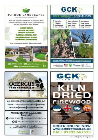 January 2025 | Phonebox Magazine 47MOB: 07931662355 | WEB: phooklandscapes.co.ukEMAIL: info@phooklandscapes.co.ukWith over 20 years%u2019 experience, we truly care about creating outstanding outside spaces & garden design that you can enjoy for years to come. Free, no-obligation quote to discuss your needs.%u2022GARDEN DESIGN%u2022PATIOS & DRIVEWAYS%u2022FENCING & DECKING%u2022NATURAL & ARTIFICAL TURF%u2022GARDEN BUILDINGS & SHEDS%u2022COMMERCIAL LANDSCAPINGTree Surgery SpecialistsWe provide professional tree care, landscaping and fencing services, in accordance with the rigorous standards laid out by the Arboricultural Association.For more information call: 01933 667575Email: enquiries@gcktreeworks.co.ukFREEquotes%u2022 Tree Felling%u2022 Pollarding%u2022 Dead Wooding%u2022 Stump Grinding%u2022 Crown Reductions%u2022 Crown Thinning%u2022 Crown Lifting%u2022 Tree Surveys%u2022 Site Clearence%u2022 Hedge Cutting%u2022 Hedge Reductions%u2022 Hedge RemovalsGCK Domestic leaflet A5.indd 1 14/08/2018 10:42TREE SURGERY SPECIALISTS www.gcktreeworks.co.ukTree FellingPollardingDead WoodingStump GrindingCrown ReductionsCrown ThinningCrown LiftingTree SurveysSite ClearanceHedge CuttingHedge ReductionsHedge RemovalsCONTACT US NOW FOR YOUR FREE NO OBLIGATION QUOTEt: 01933 667575 | e: enquiries@gcktreeworks.co.ukCALL 01933 667575FIREWOODFREE DELIVERYWITHIN 15 MILES WS6074 READY TO BURNLOW MOISTURE BRITISHwww.gckfirewood.co.ukORDER ONLINE NOWKILN DRIED Quality Hardwood Quality Softwood Kindling Nets Hardwood NetsFirelighters Locally sourced SustainableQuality Hardwood Quality Softwood Kindling Nets Hardwood & Softwood Nets. Softwood NetsFirelighters Locally Sourced Sustainable