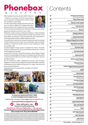 January 2025 | Phonebox Magazine 5ContentsPhonebox Magazine is owned and published by Phonebox Magazine Ltd, Unit 2, Stanley Court, Olney, Bucks MK46 5NHAdvertisers: We gratefully acknowledge the support of firms whose advertisements appear in this publication and, whilst every care is taken to ensure accuracy, the publishers regret they cannot accept responsibility for loss, damage or omission caused by error in the printing of an advertisement. Advertisements are accepted on the understanding that descriptions of goods and services are fair and accurate. All artwork is accepted on strict condition that permission has been given for use in this publication. Any reproduction of material, either advertising or editorial, is forbidden without written consent of the publishers. The publishers cannot accept responsibility for views expressed by contributors, or for the accuracy of claims made by advertisements appearing in this publication. Distribution may vary at the discretion of Phonebox Magazine Ltd.To advertise telephone (01234) 713298or email sales@phoneboxmagazine.comEmail articles and news to editorial@phoneboxmagazine.comwww.phoneboxmagazine.comTwitter: @Phonebox_magFacebook.com/PhoneboxmagDeadline for February 2025 edition - 14th JanuaryWhat%u2019s going to be your buzzword for 2025? I%u2019ve got one %u2013 I%u2019ll tell you it in a moment %u2013 which I%u2019ve come up with as part of a powerful, worldwide trend to choose a single word to define your year ahead.The idea of discovering a single, important word for the next 12 months is different from making a New Year%u2019s Resolution (which lots of people don%u2019t stick to anyway), it%u2019s fun, harmless and actually sets you thinking for a moment or two. What%u2019s going to be important to you? Sum it up in a word.Resolutions usually involve you achieving something or cutting something out for good. This word-choosing scheme is broader than that and is more about setting out intentions or goals that might steer you in the direction of real change, positive growth or greater balance in your life.You could choose a word such as %u2018courage%u2019 because you want to be stronger in 2025. Perhaps you%u2019ll go for %u2018clean%u2019 as you seek greater clarity and simpler guidelines. Or maybe you%u2019ll prefer %u2018renew%u2019 as a way of helping you refresh your priorities in life.How about %u2018grateful%u2019, %u2018energy%u2019, %u2018peace%u2019 or %u2018empathy%u2019? You choose %u2013 that%u2019s part of the fun, and then see if you can live your life with that word in your mind and heart throughout the next year.And wouldn%u2019t it be lovely if thousands of people in Olney, Newport Pagnell and the surrounding villages all took part in this initiative and all tried to follow a buzzword that will make their, and their friends and neighbours%u2019, lives just that little bit better?And my buzzword for 2025? %u2018Togetherness%u2019 because I want Phonebox Magazine to continue demonstrating the wonderful camaraderie, friendship and attachment to one another that we have in our region. And I will do my bit too, to help achieve that.Happy New Year to all our advertisers, contributors and readers. Ron Hall, Editor06 Christmas Tree Festival Branching out in Olney 08 Olney Camera Club Join up for a picture-perfect hobby 10 Readers Lively LettersHave your say, it%u2019s your magazine 12 EntertainmentThanks to Evan this month 16 Mercury Olney%u2019s regular Town Council meeting 18 Newport makeover Lovat Hall gets the works 20 Carlton House Club Christmas lunch and Crafts 22 Newport Pagnell Council NewsThe latest from Newport%u2019s councillors 24 Olney Ward CouncillorsReports from our MK team 26 Phonebox Diary Our local clubs and societies29 Phonebox Foodie Your start to the New Year30 Chris Curtis MP Our local MP has his say32 Dickens of a Christmas Picture round-up34 Pibworth ColumnThe new order? 36 Newport Pagnell & Olney Lions ClubNews from the charitable group37 CRMKThat was the year that was38 Charity News People helping others40 Georgian DancersGetting in step 41 The Bruno ProjectIt%u2019s a dog%u2019s life 42 Churches together Olney and Newport Pagnell Churches 43 Richard%u2019s Scooter Can you help? 44 Phonebox Gardening Start of the year 48 Phonebox MotoringIt%u2019s a family fun choice50 Book Review Read all about it52 Olney Ukraine News Support for those in need52 Club of the Month Growing club featured53 Sport News from the clubs54 Light entertainment Colour abounds56 News Roundup Lots more local stories 62 Quiz Corner New Year puzzler