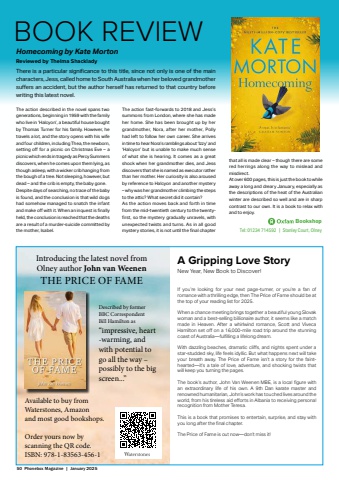 50 Phonebox Magazine | January 2025The action described in the novel spans two generations, beginning in 1959 with the family who live in %u2018Halcyon%u2019, a beautiful house bought by Thomas Turner for his family. However, he travels a lot, and the story opens with his wife and four children, including Thea, the newborn, setting off for a picnic on Christmas Eve %u2013 a picnic which ends in tragedy as Percy Summers discovers, when he comes upon them lying, as though asleep, with a wicker crib hanging from the bough of a tree. Not sleeping, however, but dead %u2013 and the crib is empty, the baby gone.Despite days of searching, no trace of the baby is found, and the conclusion is that wild dogs had somehow managed to snatch the infant and make off with it. When an inquest is fi nally held, the conclusion is reached that the deaths are a result of a murder-suicide committed by the mother, Isabel.Reviewed by Thelma ShackladyHomecoming by Kate MortonThere is a particular signifi cance to this title, since not only is one of the main characters, Jess, called home to South Australia when her beloved grandmother suff ers an accident, but the author herself has returned to that country before writing this latest novel.The action fast-forwards to 2018 and Jess%u2019s summons from London, where she has made her home. She has been brought up by her grandmother, Nora, after her mother, Polly had left to follow her own career. She arrives in time to hear Nora%u2019s ramblings about %u2018Izzy%u2019 and %u2018Halcyon%u2019 but is unable to make much sense of what she is hearing. It comes as a great shock when her grandmother dies, and Jess discovers that she is named as executor rather than her mother. Her curiosity is also aroused by reference to Halcyon and another mystery %u2013 why was her grandmother climbing the steps to the attic? What secret did it contain?As the action moves back and forth in time from the mid-twentieth century to the twentyfi rst, so the mystery gradually unravels, with unexpected twists and turns. As in all good mystery stories, it is not until the fi nal chapter BookshopTel: 01234 714592 | Stanley Court, OlneyBOOK REVIEWthat all is made clear %u2013 though there are some red herrings along the way to mislead and misdirect.At over 600 pages, this is just the book to while away a long and dreary January, especially as the descriptions of the heat of the Australian winter are described so well and are in sharp contrast to our own. It is a book to relax with and to enjoy.Described by former BBC Correspondent Bill Hamilton as%u201cimpressive, heart -warming, and with potential to go all the way %u2013 possibly to the big screen...%u201dAvailable to buy from Waterstones, Amazonand most good bookshops. Order yours now by scanning the QR code. ISBN: 978-1-83563-456-1A Gripping Love StoryNew Year, New Book to Discover! If you%u2019re looking for your next page-turner, or you%u2019re a fan of romance with a thrilling edge, then The Price of Fame should be at the top of your reading list for 2025.When a chance meeting brings together a beautiful young Slovak woman and a best-selling billionaire author, it seems like a match made in Heaven. After a whirlwind romance, Scott and Viveca Hamilton set off on a 16,000-mile road trip around the stunning coast of Australia%u2014fulfi lling a lifelong dream.With dazzling beaches, dramatic cliff s, and nights spent under a star-studded sky, life feels idyllic. But what happens next will take your breath away. The Price of Fame isn%u2019t a story for the fainthearted%u2014it%u2019s a tale of love, adventure, and shocking twists that will keep you turning the pages.The book%u2019s author, John Van Weenen MBE, is a local fi gure with an extraordinary life of his own. A 9th Dan karate master and renowned humanitarian, John%u2019s work has touched lives around the world, from his tireless aid eff orts in Albania to receiving personal recognition from Mother Teresa.This is a book that promises to entertain, surprise, and stay with you long after the fi nal chapter.The Price of Fame is out now%u2014don%u2019t miss it!fifffflffifl%u001a%u0019%u0018%u0017ff%u0016%u0015ffl%u0014%u0013%u0015%u0012%u0011ffl%u0013%u0010ffl%u0015fffl%u000f%u0013%u0012%u0015%u000effifl%u0015%u000c%u0012ff%u0013%u000b%u0015%u0011%u0019ffl%u0014flffi%u0015fifffflffifl%u001a%u0019ffifl%u0018%u0017%u0017ffi%u0017ffififffflffifl%u001a%u0019%u0018fflffi%u0017%u0016ffi%u0016%u0015%u0014ffl