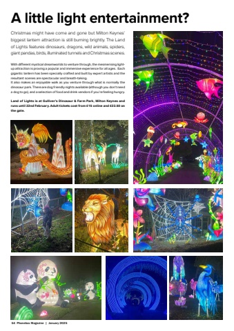 54 Phonebox Magazine | January 2025A little light entertainment?Christmas might have come and gone but Milton Keynes%u2019 biggest lantern attraction is still burning brightly. The Land of Lights features dinosaurs, dragons, wild animals, spiders, giant pandas, birds, illuminated tunnels and Christmas scenes.With diff erent mystical dreamworlds to venture through, the mesmerising lightup attraction is proving a popular and immersive experience for all ages. Each gigantic lantern has been specially crafted and built by expert artists and the resultant scenes are spectacular and breath-taking. It also makes an enjoyable walk as you venture through what is normally the dinosaur park. There are dog friendly nights available (although you don%u2019t need a dog to go), and a selection of food and drink vendors if you%u2019re feeling hungry.Land of Lights is at Gulliver%u2019s Dinosaur & Farm Park, Milton Keynes and runs until 22nd February. Adult tickets cost from %u00a315 online and %u00a322.50 on the gate.