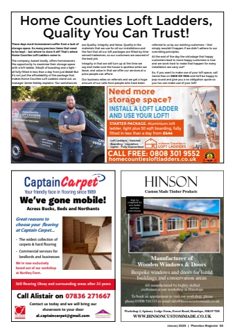 January 2025 | Phonebox Magazine 55%u2022 Loft Ladders %u2022 Hatches %u2022 Boarding %u2022 Insulation %u2022 Lights %u2022 Fully GuaranteedSTARTER PACKAGE: Aluminium loft ladder, light plus 50 sqft boarding, fully fitted in less than a day from %u00a3355Need more storage space?STARTER PACKAGE Aluminium loft INSTALL A LOFT LADDER AND USE YOUR LOFT!CALL FREE: 0808 301 9552These days most homeowners suffer from a lack of storage space. So many precious items that need to be kept %u2013 but where to store it all? That%u2019s where Home Counties Loft Ladders come in. The company, based locally, offers homeowners the opportunity to maximise their storage space with a loft ladder, 50sqft of boarding and a light - all fully fitted in less than a day from just %u00a3444! But it%u2019s not just the affordability of the package that makes Home Counties Loft Ladders stand out, as manager Jamie Oakley explains: %u2018Our watchwords are Quality, Integrity and Value. Quality in the materials that we use for all our installations and the fact that all our loft packages are fitted by time served tradesmen, so our customers are assured of the best job. Integrity in that we will turn up at the time we say and make sure the house is spotless when we leave, and value in that we offer our services at a price people can afford. Our business relies on referrals and we get a huge amount of our calls from people who have been referred to us by our existing customers - that simply wouldn%u2019t happen if we didn%u2019t adhere to our overriding principles. At the end of the day the old adage that happy customers lead to more happy customers is true and we work hard to make that happen for every installation we carry out!%u2019 So, if you want to make use of your loft space, call Jamie free on 0808 301 9552 and he%u2019ll be happy to pop round and give you a no obligation quote so you too can make use of your loft!Home Counties Loft Ladders, Quality You Can Trust!%u00a3444All manufactured by highly skilled craftsmen at our workshop in Hanslope To book an appointment to visit our workshop, pleasephone 01908 516333 or email info@hinsoncustommade.co.ukWorkshop 2, Spinney Lodge Farm, Forest Road, Hanslope, MK19 7DEWWW.HINSONCUSTOMMADE.CO.UKManufacturer of Wooden Windows & DoorsBespoke windows and doors for listed buildings and conservation areasPAS 24 compliant for new builds and barn conversions%u2022 The widest collection of carpets & hard fi ooring%u2022 Commercial services for landlords and businessesWe%u2019re now exclusively based out of our workshop at Northey Farm.Call Alistair on 07836 271667We%u2019ve gone mobile!Across Bucks, Beds and Northantsal.captaincarpet@gmail.comContact us today and we will bring our showroom to your doorGreat reasons to choose your fi ooring at Captain Carpet...Still fi ooring Olney and surrounding areas after 35 years