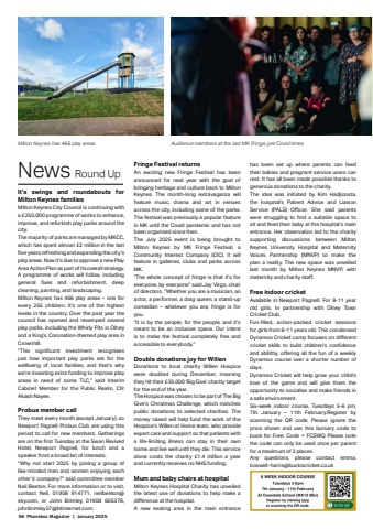 56 Phonebox Magazine | January 2025It%u2019s swings and roundabouts for Milton Keynes familiesMilton Keynes City Council is continuing with a %u00a3250,000 programme of works to enhance, improve, and refurbish play parks around the city.The majority of parks are managed by MKCC, which has spent almost %u00a32 million in the last fi ve years refreshing and expanding the city%u2019s play areas. Now it%u2019s due to approve a new Play Area Action Plan as part of its overall strategy.A programme of works will follow, including general fi xes and refurbishment, deep cleaning, painting, and landscaping. Milton Keynes has 466 play areas %u2013 one for every 255 children. It%u2019s one of the highest levels in the country. Over the past year the council has opened and revamped several play parks, including the Whirly Pits in Olney and a King%u2019s Coronation-themed play area in Crownhill. %u201cThis signifi cant investment recognises just how important play parks are for the wellbeing of local families, and that%u2019s why we%u2019re investing extra funding to improve play areas in need of some TLC,%u201d said Interim Cabinet Member for the Public Realm, Cllr Akash Nayee.Probus member callThey meet every month (except January), so Newport Pagnell Probus Club are using this period to call for new members. Gatherings are on the fi rst Tuesday at the Swan Revived Hotel, Newport Pagnell, for lunch and a speaker from a broad list of interests. %u201cWhy not start 2025 by joining a group of like-minded men and women enjoying each other%u2019s%u2019 company?%u201d said committee member Neil Beeton. For more information or to visit, contact Neil, 01908 914771, neilbeeton@sky.com, or John Brimley, 01908 605378, johnbrimley37@btinternet.com.NewsMilton Keynes has 466 play areashas been set up where parents can feed their babies and pregnant service users can rest. It has all been made possible thanks to generous donations to the charity.The idea was initiated by Kim Hadjicosta, the hospital%u2019s Patient Advice and Liaison Service (PALS) Offi cer. She said parents were struggling to fi nd a suitable space to sit and feed their baby at the hospital%u2019s main entrance. Her observation led to the charity supporting discussions between Milton Keynes University Hospital and Maternity Voices Partnership (MNVP) to make the plan a reality. The new space was unveiled last month by Milton Keynes MNVP, with maternity and charity staff .Free indoor cricketAvailable in Newport Pagnell. For 8-11 year old girls. In partnership with Olney Town Cricket Club.Fun-fi lled, action-packed cricket sessions for girls from 8-11 years old. This condensed Dynamos Cricket camp focuses on diff erent cricket skills to build children%u2019s confi dence and abilithy, off ering all the fun of a weekly Dynamos course over a shorter number of days. Dynamos Cricket will help grow your child%u2019s love of the game and will give them the opportunity to socialise and make friends in a safe environment.Six-week indoor course, Tuesdays 5-6 pm, 7th January %u2013 11th February.Register by scanning the QR code. Please ignore the price shown and use this bursary code to book for Free: Code = FCSWQ Please note the code can only be used once per parent for a maximum of 3 places. Any questions, please contact emma.boswell-harris@buckscricket.co.ukFringe Festival returns An exciting new Fringe Festival has been announced for next year with the goal of bringing heritage and culture back to Milton Keynes. The month-long extravaganza will feature music, drama and art in venues across the city, including some of the parks. The festival was previously a popular feature in MK until the Covid pandemic and has not been organised since then.The July 2025 event is being brought to Milton Keynes by MK Fringe Festival, a Community Interest Company (CIC). It will feature in galleries, clubs and parks across MK.%u201cThe whole concept of fringe is that it%u2019s for everyone, by everyone%u201d said Jay Virgo, chair of directors. %u201cWhether you are a musician, an actor, a performer, a drag queen, a stand-up comedian %u2013 whatever you are, fringe is for you.%u201cIt is by the people, for the people, and it%u2019s meant to be an inclusive space. Our intent is to make the festival completely free and accessible to everybody.%u201dDouble donations joy for WillenDonations to local charity Willen Hospice were doubled during December, meaning they hit their %u00a335,000 %u2018Big Give%u2019 charity target for the end of the year. The Hospice was chosen to be part of The Big Give%u2019s Christmas Challenge, which matches public donations to selected charities. The money raised will help fund the work of the Hospice%u2019s Willen at Home team, who provide expert care and support so that patients with a life-limiting illness can stay in their own home and live well until they die. This service alone costs the charity %u00a31.4 million a year and currently receives no NHS funding. Mum and baby chairs at hospitalMilton Keynes Hospital Charity has unveiled the latest use of donations to help make a diff erence at the hospital.A new seating area in the main entrance Audience members at the last MK Fringe, pre Covid times Round Up