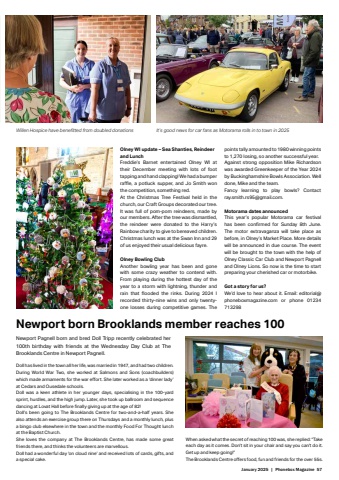January 2025 | Phonebox Magazine 57Olney WI update %u2013 Sea Shanties, Reindeer and LunchFreddie%u2019s Barnet entertained Olney WI at their December meeting with lots of foot tapping and hand clapping!%u00a0We had a bumper raffl e, a potluck supper, and Jo Smith won the competition, something red.At the Christmas Tree Festival held in the church, our Craft Groups decorated our tree.It was full of pom-pom reindeers, made by our members.%u00a0After the tree was dismantled, the reindeer were donated to the Harry%u2019s Rainbow charity to give to bereaved children.Christmas lunch was at the Swan Inn and 29 of us enjoyed their usual delicious fayre.Olney Bowling ClubAnother bowling year has been and gone with some crazy weather to contend with. From playing during the hottest day of the year to a storm with lightning, thunder and rain that fl ooded the rinks. During 2024 I recorded thirty-nine wins and only twentyone losses during competitive games. The Willen Hospice have benefi tted from doubled donations It%u2019s good news for car fans as Motorama rolls in to town in 2025points tally amounted to 1980 winning points to 1,270 losing, so another successful year.Against strong opposition Mike Richardson was awarded Greenkeeper of the Year 2024 by Buckinghamshire Bowls Association. Well done, Mike and the team.Fancy learning to play bowls? Contact ray.smith.rs95@gmail.com.Motorama dates announcedThis year%u2019s popular Motorama car festival has been confi rmed for Sunday 8th June. The motor extravaganza will take place as before, in Olney%u2019s Market Place. More details will be announced in due course. The event will be brought to the town with the help of Olney Classic Car Club and Newport Pagnell and Olney Lions. So now is the time to start preparing your cherished car or motorbike.Got a story for us?We%u2019d love to hear about it. Email: editorial@phoneboxmagazine.com or phone 01234 713298Doll has lived in the town all her life, was married in 1947, and had two children. During World War Two, she worked at Salmons and Sons (coachbuilders) which made armaments for the war eff ort. She later worked as a %u2018dinner lady%u2019 at Cedars and Ousedale schools.Doll was a keen athlete in her younger days, specialising in the 100-yard sprint, hurdles, and the high jump. Later, she took up ballroom and sequence dancing at Lovat Hall before fi nally giving up at the age of 82!Doll%u2019s been going to The Brooklands Centre for two-and-a-half years. She also attends an exercise group there on Thursdays and a monthly lunch, plus a bingo club elsewhere in the town and the monthly Food For Thought lunch at the Baptist Church.She loves the company at The Brooklands Centre, has made some great friends there, and thinks the volunteers are marvellous.Doll had a wonderful day %u2018on cloud nine%u2019 and received lots of cards, gifts, and a special cake.Newport Pagnell born and bred Doll Tripp recently celebrated her 100th birthday with friends at the Wednesday Day Club at The Brooklands Centre in Newport Pagnell.Newport born Brooklands member reaches 100When asked what the secret of reaching 100 was, she replied: %u201cTake each day as it comes. Don%u2019t sit in your chair and say you can%u2019t do it. Get up and keep going!%u201dThe Brooklands Centre off ers food, fun and friends for the over 55s.