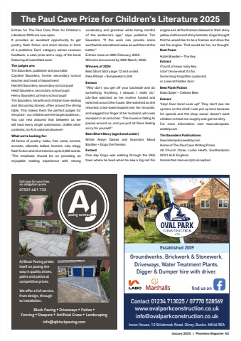 January 2025 | Phonebox Magazine 63Block Paving %u2022 Driveways %u2022 Patios %u2022 Fencing %u2022 Sleepers %u2022 Artificial Grass %u2022 Landscapinginfo@ajblockpaving.comAJ Block Paving pridesitself on paving theway in quality drives,paths and patios atcompetitive prices.We offer a full service,from design, throughto installation.07551 461 733Call now for your free,no obligation quoteGroundworks, Brickwork & Stonework.Driveways, Water Treatment Plants,Digger & Dumper hire with driver.Established 2009www.ovalparkconstruction.co.ukinfo@ovalparkconstruction.co.ukIncon House, 10 Stilebrook Road, Olney, Bucks. MK46 5EAfind us onContact 01234 713025 / 07770 528569The Paul Cave Prize for Children%u2019s Literature 2025Entries for The Paul Cave Prize for Children%u2019s Literature 2025 are now open.It provides an excellent opportunity to get poetry, fl ash fi ction and short stories in front of a publisher. Each category winner receives feedback, a cash prize and a copy of the book featuring all submitted work.%u00a0The judges are:%u00a0Tim Saunders, publisher and journalistCaroline Saunders, former secondary school teacher and head of departmentHarriett Saunders, secondary school pupilHeidi Saunders, secondary school pupilHenry Saunders, primary school pupilTim Saunders, his wife and children love reading and discussing stories, often around the dining table. This makes them the perfect judges for this prize - our children are the target audience... You can rest assured that between us we will%u00a0 read every single submission. Unlike other contests, no AI is used whatsoever!What we%u2019re looking for:All forms of poetry: haiku, free verse, sonnet, acrostic, villanelle, ballad, limerick, ode, elegy, fl ash fi ction and short stories up to 5,000 words.%u201cThe emphasis should be on providing an enjoyable reading experience with strong vocabulary and grammar while being mindful of the audience%u2019s age,%u201d says publisher Tim Saunders. %u201cIf the work can provide some worthwhile educational value as well then all the better.%u201d%u00a0Entries close on 28th February, 2025.%u00a0Winners announced by 30th March, 2025.Winners of 2024Best Short Story (age 12 and under)Pete Pitman %u2013 Rumpleskin%u2019s StiltExtract%u201cWhy don%u2019t you get off your backside and do something. Anything. I despair. I really do.%u201d Lily-Sue watched as her mother fussed and twitched around the house. She watched as she returned, a tea-towel draped over her shoulder, and wagged her fi nger at her husband, who was slumped in an armchair. %u201cThe house is falling to pieces around us, and you just sit there feeling sorry for yourself.%u201dBest Short Story (age 8 and under)Writer Alwyn Davies and illustrator Maud Bazillier %u2013 Gogo the fi remanExtractOne day Gogo was walking through the little town where he lived when he saw a big red fi re engine and all the fi remen dressed in their shiny yellow clothes and shiny helmets. Gogo thought that he would like to be a fi reman and drive the red fi re engine. That would be fun, he thought.Best PoemHazel Bowden %u2013 The KeyExtractI found a heavy rusty key.I don%u2019t know what it%u2019s for.Some long-forgotten cupboard,or a secret hidden door.Best Flash FictionDaan Spijer %u2013 Celeste BearExtract%u201cHey! Over here! Look up!%u201d They don%u2019t see me up here on the shelf. I was put up here because I%u2019m special and the shop owner doesn%u2019t want children to treat me roughly and get me dirty.For more information visit:%u00a0 tsaunderspubs.weebly.com%u00a0Tim Saunders Publications%u00a0tsaunderspubs.weebly.comHome of%u00a0The Paul Cave Writing Prizes49 Church Close, Locks Heath, Southampton SO31 6LR. England.Unsolicited manuscripts accepted.