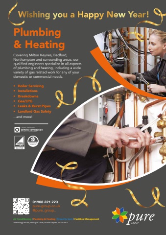 64 Phonebox Magazine | January 2025PHONEBOX MAGAZINE IS PUBLISHED BY PHONEBOX MAGAZINE LTD, UNIT 2 STANLEY COURT, OLNEY, BUCKS MK46 5NH - TEL 01234 71329801908 221 223pure-group.co.uk@pure_group_Air Conditioning | Plumbing & Heating | Property Care | Facilities ManagementTechnology House, Michigan Drive, Milton Keynes, MK15 8HQPlumbing & HeatingCovering Milton Keynes, Bedford, Northampton and surrounding areas, our of plumbing and heating, including a wide variety of gas related work for any of your domestic or commercial needs.%u2022 Boiler Servicing%u2022 Installations %u2022 Breakdowns%u2022 Gas/LPG%u2022 Leaks & Burst Pipes%u2022 Landlord Gas Safety...and more!