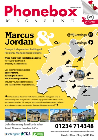 February 2025 | Phonebox Magazine 130YEARSLatest Local News Events & BusinessFebruary 2025MJLettings@MJLettings01234 714348www.marcusjordan.co.uk %u2022 enquiries@marcusjordan.co.uk1 Market Place, Olney, MK46 4EAOlney%u2019s independent Lettings & Property Management expertsWe%u2019re more than just letting agents;we%u2019re your partners in property management. Our extensive reach across Bedfordshire, Buckinghamshire and Northamptonshireensures your property is seen and leased by the right tenants. We have valued the service with Marcus Jordan for many years now, as landlords they have always been on hand for any queries we have had and act quickly when required. It is always a smooth and hassle free experience when a tenant leaves and new one moves in. We would highly recommend.Join the many landlords who trust Marcus Jordan & CoNorthamptonNewport PagnellMilton KeynesAmpthillBedford