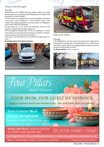 February 2025 | Phonebox Magazine 11Four Course Meal %u00a325.95 per personIncludes: Starter, Main Course, Rice and Naan, and a glass of wine for Mum!60 High Street, Olney Buckinghamshire %u2022 www.the4pillarsrestaurant.co.ukFour PillarsTandoori RestaurantYOUR MUM, OUR GUEST OF HONOUREnjoy a relaxed meal this Mothers Day - We will look after everythingTel: 01234 714083 / 711563 Sunday 30th March - Reserve a spot now Give Mum a truly enjoyable day!Open 1 %u2013 11pm Sundays / 5.30pm %u2013 11.30pm every other day * Additional surcharge on seafood*Why use one space, when two are available?Sign up for OlneyDear SirI was delighted to see how quick the local council replaced the damaged town noticeboard in the Market Place. It%u2019s a useful source of local information which I use regularly. Well done Olney Council for the work you do around our town. An Olney resident (address supplied)Olney%u2019s new fi re engineOlney%u2019s new fi re engineDear SirExciting news here at BFRS Olney Fire Station today. Last month the crew went to our workshops at BFRS Aylesbury Fire Station and picked up our new fi re engine.This 2017 Volvo is an upgrade from our previous appliance, boasting new electric rescue equipment, a more powerful pump, more modern technology, and greater room in the cab for our fi refi ghters, just to name a few of the upgrades.A huge thank you to our stores and workshops team for their support in getting the fi re engine ready for us.The new appliance offi cially went %u2018on the run%u2019 available at 11.30am this morning, and received its fi rst emergency incident at 12.44pm, marking the start of its busy life here at Olney.If you see us out and about on our new shiny fi re engine, give us a wave.Buckinghamshire Fire & Rescue Service