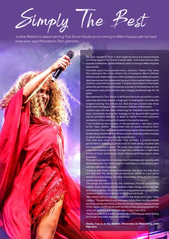 14 Phonebox Magazine | February 2025Justine Riddoch%u2019s award-winning Tina Turner tribute act is coming to Milton Keynes with her best show ever, says Phonebox%u2019s Tom Johnston.Simply The BestThe true %u2018Queen of Rock %u2018n%u2019 Roll%u2019 might be dead, but several tribute acts keep legend Tina Turner%u2019s music alive %u2013 and none more so than popular entertainer Justine Riddoch, who%u2019s coming to Milton Keynes next month.Fourteen years have passed since Justine%u2019s Totally Tina show fi rst sprang to life in the vibrant city of Liverpool. But a Lifetime Achievement Award and many other prestigious accolades along the way have earned her a deserved top spot in the musical tribute world.Justine, a past winner of popular TV talent show Stars In Their Eyes when she performed as Anastacia, is known in the business for her enthusiasm and drive and has been singing professionally for 30 years. She switched to Tina Turner in 2010 and has built around her a cast and crew who have played a huge part in helping her to create the longest-running Tina tribute act. And she has a brand new show which she%u2019s bringing to Milton Keynes%u2019 Stables in Wavendon. Justine says she has been observing her beloved muse from the start: constantly honing her homage to the legend with passion and an unrivalled attention to detail, to deliver the most authentic recreation of the rock and roll queen%u2019s live performances.%u201cI am thrilled by the success of this production %u2013 we have come so far,%u201d says Justine. %u201cHaving been told on many occasions that I sounded like Tina, I decided to take the plunge and then spent hours familiarising myself with her life story and scrutinising video footage to watch mannerisms and body movements.%u201dThe cast and crew of Totally Tina promise a custom-made performance featuring a whole host of fresh ideas, coupled with the band%u2019s famous humour. The show, says Justine, is designed to make the audience feel that the legendary performer is right there in front of them, strutting her stuff on the most famous legs in show business.This year%u2019s production is a heady mix of nostalgia and surprise with all the favourite Tina Turner hits, her best duets, much-loved covers and the odd twist in the tale. Jumping Jack Flash, Honky Tonk Woman, Get Back, It%u2019s Only Rock and Roll, and The Bitch is Back have been added to a set which already includes Simply The Best, Proud Mary, Nutbush City Limits and Private Dancer.The songs are enhanced by the customary fl ourish of sparkling stiletto heels, fl amboyant tail feathers, high-energy dance routines and musical genius. There%u2019s audience engagement and a post-show %u2018meet and greet%u2019 too, making it all the more personal.%u201cWe always add our own personality to the show each year,%u201d adds Justine. %u201cThe element of surprise keeps things fresh, but my ultimate aim is to remain faithful to a Tina Turner live concert paying tribute to her career and bring the best version of this amazing woman: her voice, her passion and even her legs, to her many fans. %u201cThat%u2019s why we love it when people tell us that they go away feeling as though they have seen the real thing.%u201dTotally Tina is at the Stables, Wavendon on Wednesday 26th February.