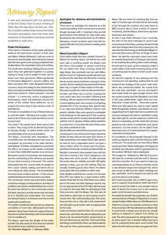 16 Phonebox Magazine | February 2025Mercury ReportA new year beckoned with the gathering of the fi rst Olney Town Council meeting of 2025. But that was about all that was %u2018new%u2019. As councillors settled down around the table, it became abundantly clear that there were still plenty of old problems, old issues and old squabbles to overcome.Public ParticipationThere were no members of the public wishing to speak at the open forum section. In that case, said Mayor Debbie Whitworth, I will use some of the time to read this letter. She held aloft a missive that had been given to her by angry residents from Yardley Manor, the new estate in the north of Olney.The locals were revolting. Feeling fed up and let down they had gathered together in a posse, hoping to bring a bit of weight to their call for action over their grievances. Referring directly to Phonebox Magazine%u2019s January edition, the letter was about their %u2018utter disappointment and concerns%u2019 about the delays to the infrastructure and community amenities that had been promised when they moved in. These included %u2013 and still include %u2013 a community centre, a playground, landscaping, roads and pathways around the whole of the estate, flood defences, an art project and a bus stop. It was clearly a case of %u2018bad Manors%u2019.The lack of completion of any of these features is, said the letter, %u2018aff ecting the quality of the lives of all of those who have decided to come to your town%u2019. %u2018Your town%u2019? The words had a %u2018them and us%u2019 feel to them. They hung in the air like the fog down at Goosey Bridge. A veiled threat which sat uncomfortably in the council chambers.The Mayor continued with trepidation. The committee fear the development will never be completed %u2018as promised in the sales pitches%u2019, read Debbie. The letter reminded the council that the 200 or so houses on the estate contribute to more than %u00a3250,000 towards local services. We spend money in local shops and restaurants and are contributing to the vibrancy and growth of your local economy, it boomed. The writers demanded that the council adds its weight to their cause: namely making sure there are no more delays by Vistry Group %u2013 the housebuilder formerly known as Bovis Homes %u2013 to the various residential features that have been promised. The community centre was particularly singled out by the unhappy correspondence, as a litany of problems was slowly unfolded before the council. No work has started on the community centre, the letter reported, and the whole area set aside for it is %u2018fl ooded and underwater%u2019. Our houses are being fl ooded, it continued, and %u2018we are still awaiting fl ood defences%u2019. The estate%u2019s residents have now set up a steering committee of more than 200 people and have asked for Olney Town Council to support them as they demonstrate that delays will not be tolerated (%u2018not on my Manor%u2019). The Mayor said that the details of the letter couldn%u2019t be discussed at that time but wanted the contents to be noted by councillors. Apologies for absence and declarations of interestThere were no apologies for absence as a full council was sitting. %u2018Full%u2019 is a loose term at present though, because, with 11 members, they are still several short of the desired 15. Town Clerk Jane Brushwood was welcomed back by the Mayor following a recent accident which had left her injured. Minutes from the previous meeting were approved.Ward Councillor%u2019s ReportCold-ridden Keith McLean readied himself to deliver his monthly report, but before he could even take a snuffling breath the Mayor said she had a %u2018mini update%u2019 to impart concerning the so-called One Stop crossing along the High Street. She and Keith had met with Milton Keynes Council%u2019s highways people late last year to discuss the data they had about the crossing and its camera which had been running for three months. At that meeting it was reported that there were only %u2018a couple%u2019 of near-misses on the site.One was a cyclist who had not dismounted from his bike, and there was a runner crossing the road, which was also recorded. Following that meeting, offi cers agreed to the following steps: a street lighting team will conduct a full lighting assessment of the crossing; they agreed also to an improved flashing %u2018Belisha%u2019 beacon with greater visibility; they were going to investigate road markings on the approach to the crossing; and the camera which monitors the site will remain until the end of January. Debbie asked residents to contact her or Councillor McLean if there were any other incidents of note.Deirdre Bethune said that the iron posts near the crossing were %u2018one of the worst things%u2019 about the facility as they obscure the view from drivers. It hides pedestrians, she added. David Tyler agreed, he said he had a stigmatism which can give a %u2018starry effect%u2019 when he drives past the posts. And David Chennells nodded wholeheartedly at Deirdre%u2019s comment: three people have told him that the crossing is the %u2018most dangerous one they have ever come across%u2019, he said, because the posts obscure visibility and with LED lights shining on them, you can see nothing. They are actually inhibiting good vision there, he added, particularly with cars parked on either side.Colin Rodden said that the concern he had was that OTC has asked for a push-button traffic system there like the two that Olney has a either end of the town, but that highways experts say it%u2019s not appropriate at the One Stop site because of a bend in the road. Well, it%u2019s all leading to that fi nal outcome, said the Mayor. No, that was all done before, said Colin, so we%u2019re going round in circles here. My understanding was that when they put this one in, they did a risk assessment and decided a push button was not appropriate for the road. It was a cost issue, said the Clerk