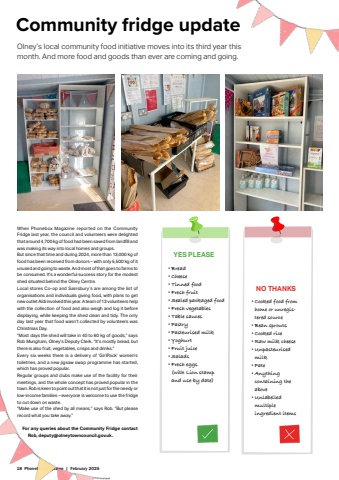 18 Phonebox Magazine | February 2025Community fridge updateOlney%u2019s local community food initiative moves into its third year this month. And more food and goods than ever are coming and going.When Phonebox Magazine reported on the Community Fridge last year, the council and volunteers were delighted that around 4,700 kg of food had been saved from landfi ll and was making its way into local homes and groups.But since that time and during 2024, more than 13,000 kg of food has been received from donors %u2013 with only 5,500 kg of it unused and going to waste. And most of that goes to farms to be consumed. It%u2019s a wonderful success story for the modest shed situated behind the Olney Centre.Local stores Co-op and Sainsbury%u2019s are among the list of organisations and individuals giving food, with plans to get new outlet Aldi involved this year. A team of 13 volunteers help with the collection of food and also weigh and log it before displaying, while keeping the shed clean and tidy. The only day last year that food wasn%u2019t collected by volunteers was Christmas Day.%u201cMost days the shed will take in 40 to 60 kg of goods,%u201d says Rob Mungham, Olney%u2019s Deputy Clerk. %u201cIt%u2019s mostly bread, but there is also fruit, vegetables, crisps and drinks.%u201dEvery six weeks there is a delivery of %u2018GirlPack%u2019 women%u2019s toiletries, and a new jigsaw swap programme has started, which has proved popular. Regular groups and clubs make use of the facility for their meetings, and the whole concept has proved popular in the town. Rob is keen to point out that it is not just for the needy or low-income families %u2013 everyone is welcome to use the fridge to cut down on waste. %u201cMake use of the shed by all means,%u201d says Rob. %u201cBut please record what you take away.%u201dFor any queries about the Community Fridge contact Rob, deputy@olneytowncouncil.gov.uk.YES PLEASENO THANKS%u2022 Bread%u2022 Cheese%u2022 Tinned food%u2022 Fresh fruit %u2022 Sealed packaged food%u2022 Fresh vegetables%u2022 Table sauces%u2022 Pastry%u2022 Pasteurised milk%u2022 Yoghurt%u2022 Fruit juice%u2022 Salads%u2022 Fresh eggs (with Lion stamp and use-by date)%u2022 Cooked food from home or unregistered source%u2022 Bean sprouts%u2022 Cooked rice%u2022 Raw milk cheese%u2022 Unpasteurised milk%u2022 Pate%u2022 Anything containing the above%u2022 Unlabelled multiple ingredient items