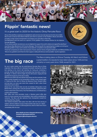 February 2025 | Phonebox Magazine 31Flippin%u2019 fantastic news!Olney%u2019s Pancake Race organisers are delighted to welcome two new main sponsors for the race in 2025.Much-loved conserve brand Bonne Maman joins them as sponsor of the Children%u2019s Races and will be providing a range of jams and spreads to accompany your pancakes on Race Day. And Blackstone joins the event as a sponsor of the griddles in the marquee kitchen for the fabulous Pancake Breakfast. %u201cAs an outdoor griddle manufacturer, we are delighted to support the world%u2019s oldest and original Pancake Race,%u201d says Steven May, Blackstone%u2019s UK Country Manager. %u201cPartnering with the organising team enables us to bring our fl at plate griddles to help cook hundreds of pancakes for competitors and spectators alike.%u201dThese two companies join other main sponsors, Francis Jackson Homes, Kingsley Healthcare, and Whitworth Bros. Ltd.%u201cWe are very grateful to all of them for their support, making this famous event possible,%u201d say the organisers.It%u2019s a great start to 2025 for the historic Olney Pancake RaceThe big raceThe Race is taking place on Shrove Tuesday, 4th March and follows a great tradition; it%u2019s reputed to have taken place since 1445 and has certainly run every year since 1948, except for 2021. No one is quite certain how the world-famous Pancake Race at Olney originated. One story tells of a harassed housewife, hearing the shriving bell, dashing to the church still clutching her frying pan containing a pancake. Another tells that the gift of pancakes may have been a bribe to the Ringer, or Sexton, that he might ring the bell sooner; ringing the bell signalled the beginning of the day%u2019s holiday. While the race itself may have lapsed many times over the centuries, it was never entirely forgotten by the womenfolk of Olney. It was revived again in 1948 by the then Vicar of Olney, the Reverend Canon Ronald Collins and has been run every year since then, except for 2021, when Covid restrictions were in place.Ahead of the race itself, there are lots of activities taking place in the Market Place, starting with a special pancake breakfast, prepared by Ben Francis, Head Chef of the Cherry Tree Pub & Restaurant, and followed by a cookery demonstration. With stalls, even more pancakes, music, a fabulous grand raffl e, plus races for local nurseries and schoolchildren, there will be something for everyone. The Race will also welcome Fred, Homepride%u2019s bowler-hatwearing Chief Flour Grader. The ticketed breakfast takes place from 8am, with the fi nal serving at 9.30am, with the children%u2019s races at 10am and the main race at 11.55am. All the runners join visitors in a Shriving Service, which is held in the church immediately after the race. More details are here: olneypancakerace.org, Facebook: @olneypancakerace, Instagram @theolneypancakeracePULL OUT AND KEEP