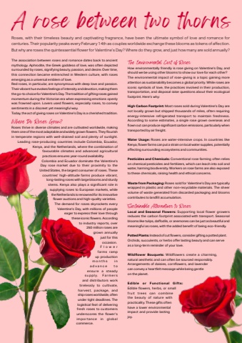 38 Phonebox Magazine | February 2025The association between roses and romance dates back to ancient mythology. Aphrodite, the Greek goddess of love, was often depicted surrounded by roses, signifying beauty, passion, and desire. Over time, this connection became entrenched in Western culture, with roses emerging as a universal emblem of love.Red roses, in particular, are synonymous with deep love and passion. Their vibrant hue evokes feelings of intensity and devotion, making them the go-to choice for Valentine%u2019s Day. The tradition of gifting roses gained momentum during the Victorian era when expressing emotions openly was frowned upon. Lovers used fl owers, especially roses, to convey sentiments in a discreet yet meaningful way.Today, the act of giving roses on Valentine%u2019s Day is a cherished tradition.Where Do Roses Grow?Roses thrive in diverse climates and are cultivated worldwide, making them one of the most adaptable and widely grown fl owers. They fl ourish in temperate regions with well-drained soil and plenty of sunlight. Leading rose-producing countries include Colombia, Ecuador, Kenya, and the Netherlands, where the combination of favourable climates and advanced agricultural practices ensures year-round availability.Colombia and Ecuador dominate the Valentine%u2019s Day rose market due to their proximity to the United States, the largest consumer of roses. These countries%u2019 high-altitude farms produce vibrant, long-lasting roses with large blooms and sturdy stems. Kenya also plays a signifi cant role in supplying roses to European markets, while the Netherlands is renowned for its innovative fl ower auctions and high-quality varieties.The demand for roses skyrockets every Valentine%u2019s Day, with millions of people eager to express their love through these iconic fl owers. According to industry reports, over 250 million roses are grown annually just for this occasion. F l o w e r farms ramp up production m o n t h s i n a d v a n c e t o ensure a steady s u p p l y. Fa r m e r s and distributors work tirelessly to cultivate, harvest, package, and ship roses worldwide, often under tight deadlines. The logistical feat of delivering fresh roses to customers underscores the flower%u2019s impor tance in global commerce.A rose between two thornsThe Envirfi mental Cost of RosesHow environmentally friendly is rose giving on Valentine%u2019s Day, and should we be using other blooms to show our love for each other?The environmental impact of rose-giving is a topic gaining more attention as sustainability becomes a global priority. While roses are iconic symbols of love, the practices involved in their production, transportation, and disposal raise questions about their ecological footprint. Here%u2019s why:High Carbon Footprint: Most roses sold during Valentine%u2019s Day are not locally grown but shipped thousands of miles, often requiring energy-intensive refrigerated transport to maintain freshness. According to some estimates, a single rose grown overseas and fl own out can produce signifi cant carbon emissions, particularly when transported by air freight.Water Usage: Roses are water-intensive crops. In countries like Kenya, fl ower farms can put a strain on local water supplies, potentially aff ecting surrounding ecosystems and communities.Pesticides and Chemicals: Conventional rose farming often relies on chemical pesticides and fertilizers, which can leach into soil and water, harming biodiversity. Workers on rose farms are also exposed to these chemicals, raising health and ethical concerns.Waste from Packaging: Roses sold for Valentine%u2019s Day are typically wrapped in plastic and other non-recyclable materials. The sheer volume of waste generated from discarded packaging and blooms contributes to landfi ll accumulation.Sustainable Alternatives to RosesLocal and Seasonal Flowers: Supporting local flower growers reduces the carbon footprint associated with transport. Seasonal blooms like tulips, daff odils, or anemones can be just as beautiful and meaningful as roses, with the added benefi t of being eco-friendly.Potted Plants: Instead of cut fl owers, consider gifting a potted plant. Orchids, succulents, or herbs off er lasting beauty and can serve as a long-term reminder of your love.Wildflower Bouquets: Wildflowers create a charming, natural aesthetic and can often be sourced responsibly. Arrangements of daisies, cornfl owers, and lavender can convey a heartfelt message while being gentle on the planet.Edible or Functional Gifts: Edible flowers, herbs, or small fruit trees can combine the beauty of nature with practicality. These gifts often have a lower environmental impact and provide lasting joy.Roses, with their timeless beauty and captivating fragrance, have been the ultimate symbol of love and romance for centuries. Their popularity peaks every February 14th as couples worldwide exchange these blooms as tokens of aff ection. But why are roses the quintessential fl ower for Valentine%u2019s Day? Where do they grow, and just how many are sold annually?