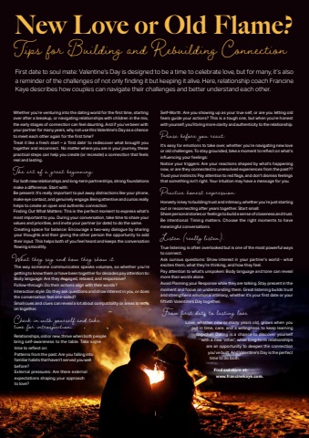 February 2025 | Phonebox Magazine 41Whether you%u2019re venturing into the dating world for the fi rst time, starting over after a breakup, or navigating relationships with children in the mix, the early stages of connection can feel daunting. And if you%u2019ve been with your partner for many years, why not use this Valentine%u2019s Day as a chance to meet each other again for the fi rst time? Treat it like a fresh start %u2013 a %u2018fi rst date%u2019 to rediscover what brought you together and reconnect. No matter where you are in your journey, these practical steps can help you create (or recreate) a connection that feels real and lasting. The art of a great begi%u0013 ing: For both new relationships and long-term partnerships, strong foundations make a diff erence. Start with: Be present: It%u2019s really important to put away distractions like your phone, make eye contact, and genuinely engage. Being attentive and curios really helps to create an open and authentic connection. Finding Out What Matters: This is the perfect moment to express what%u2019s most important to you. During your conversation, take time to share your values and priorities, and invite your partner (or date) to do the same. Creating space for balance: Encourage a two-way dialogue by sharing your thoughts and then giving the other person the opportunity to add their input. This helps both of you feel heard and keeps the conversation fl owing smoothly. What they say and how they show it The way someone communicates speaks volumes, so whether you%u2019re getting to know them or have been together for decades pay attention to: Body language: Are they engaged, relaxed, and responsive? Follow-through: Do their actions align with their words? Interaction style: Do they ask questions and show interest in you, or does the conversation feel one-sided? Small cues and clues can reveal a lot about compatibility or areas to work on together. Check in with yourself and take time for introspection.Relationships, old or new, thrive when both people bring self-awareness to the table. Take some time to refl ect on: Patterns from the past: Are you falling into familiar habits that haven%u2019t served you well before? External pressures: Are there external expectations shaping your approach to love? Self-Worth: Are you showing up as your true self, or are you letting old fears guide your actions? This is a tough one, but when you%u2019re honest with yourself, you%u2019ll bring more clarity and authenticity to the relationship. Pause before you react: It%u2019s easy for emotions to take over, whether you%u2019re navigating new love or old challenges. To stay grounded, take a moment to refl ect on what%u2019s infl uencing your feelings: Notice your triggers: Are your reactions shaped by what%u2019s happening now, or are they connected to unresolved experiences from the past?? Trust your instincts: Pay attention to red fl ags, and don%u2019t dismiss feelings that something isn%u2019t right. Your intuition may have a message for you. Practice honest expre%u0081 ion: Honesty is key to building trust and intimacy, whether you%u2019re just starting out or reconnecting after years together. Start small: Share personal stories or feelings to build a sense of closeness and trust. Be intentional: Timing matters. Choose the right moments to have meaningful conversations. Listen (rea%u0090 y listen): True listening is often overlooked but is one of the most powerful ways to connect. Ask curious questions: Show interest in your partner%u2019s world - what excites them, what they%u2019re thinking, and how they feel. Pay attention to what%u2019s unspoken: Body language and tone can reveal more than words alone. Avoid Planning your Response while they are talking. Stay present in the moment and focus on understanding them. Great listening builds trust and strengthens emotional intimacy, whether it%u2019s your fi rst date or your fi ftieth Valentine%u2019s Day together. From first date to lasting love Love, whether new or many years old, grows when you put in time, care, and a willingness to keep learning together. Dating is a chance to discover yourself with a new %u2018other%u2019, while long-term relationships are an opportunity to deepen the connection you%u2019ve built. And Valentine%u2019s Day is the perfect time to do both. Find out more at: www.francinekaye.com.New Love or Old Flame? Tips for Building and Rebuilding Co%u0013 ectionFirst date to soul mate: Valentine%u2019s Day is designed to be a time to celebrate love, but for many, it%u2019s also a reminder of the challenges of not only fi nding it but keeping it alive. Here, relationship coach Francine Kaye describes how couples can navigate their challenges and better understand each other.