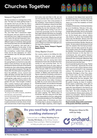 42 Phonebox Magazine | February 2025Newport Pagnell (CTNP)We fi nd ourselves in a strange time of the year. The days are slowly getting longer, if not warmer and if you are, like me, near a river, the ground around us is truly soaked through and regularly fl ooded. But I fi nd that period around the end of winter and into spring to be a time of great hope.Yes, your New Year%u2019s resolutions might be long gone, and your desire to eat less and exercise more, might be paused until Lent maybe. But spring brings great hope. I collect some rare fl owers, many of which are diff erent types of snowdrops. Most people don%u2019t know that there are over 500 diff erent varieties of snowdrop, and each has a very small diff erence to the other. To the untrained or uninitiated, a snowdrop looks like a snowdrop. I collect them, although many can be very expensive, so I don%u2019t own anywhere near the 500-plus varieties available.This time of year is the world of the snowdrop. The toughest and hardiest of the spring fl owers it is the fi rst to arise after winter%u2019s frost and fl ood. I%u2019ve seen the tips growing into leaves and buds of the fl owers bursting into their white blooms (although you can get yellow and green). This sign of a fl ower after the winter gives me great hope. Soon the daffodils, crocus, muscari and tulips will follow, and then with the warmth of spring the lawn starts growing and my small garden really starts to come to life. The spring will bring nesting birds to the garden; this year I have bought a nestbox with a camera, hoping to get a glimpse of nesting bluetits or great tits. And all of this is signposted by the emergence of my friends the snowdrops.It reminds me of a Bible verse:%u201cAs long as the earth endures, seedtime and harvest, cold and heat,summer and winter, day and night will never cease.%u201d (Genesis 8:22)The seasons come and go, there are times to plant and times to harvest, times of dark and cold and times of warm long evenings. And every now and then in life, we can see the promise that a hard, cold time is coming to an end. This is the promise of the snowdrop. I look forward to seeing my collection of snowdrops, not just to see what has survived the winter and the dreaded snowdrop fl y, but also because it tells of warmer lighter times coming. If you are in a hard time personally, look for the things that might indicate that times are changing and there is hope and a promise that it isn%u2019t always cold and dark. Maybe pray and ask God for a sign of a movement out of a time of struggle and into a diff erent season. Look out for things in our lives that might give you the hope of a snowdrop.Peter Young, Pastor, Newport Pagnell Baptist Church.Olney Baptist ChurchOur country seems to be falling into dire times as the economy reels, dreadful corruption is exposed in state and church hierarchies, and our young have been betrayed by those who should have been caring for and nurturing them. So it%u2019s encouraging that there are clear signs of reformation and restoration at the beginning of this new year, 2025. For starters, last year saw a twenty-two-per-cent increase in the number of Bibles sold world-wide, and fi gures reveal that Christianity continues to grow quietly and steadily with its message of love and salvation. It has been estimated that there will be three billion Christians by 2050. So, as we come to the end of the Christmas season, we can take its message of new birth and restoration into our lives and face the future confi dently.Personally, I had a lovely Christmas Day, with members of the family gathered around the piano singing %u2018The Twelve Days of Christmas.%u2019 We each sang one of the days %u2013 I was responsible for the four calling birds %u2013 and everybody belted out %u2018Five Gold Rings!%u2019 The twelve days of Christmas are from Christmas Day to January 5, Epiphany Eve, or Twelfth Night. Epiphany, which begins on January 6, has always been special for Christians because it commemorates the arrival of the magi to worship the baby, Jesus, so it is the fi rst revelation of Christ to Gentiles.In Eastern Christendom, Christmas festivities go on to Candlemas, February 2 this year. Candlemas commemorates Mary and Joseph taking the baby Jesus to the temple for the ritual presentation of the fi rstborn son. At the temple was a devout, elderly Jew, Simeon, to whom God revealed that Jesus was the Messiah. Simeon took the baby into his arms and said what has come to be known as the Nunc Dimittis, %u2018Now let me depart.%u2019 He was ready to die because he had seen the salvation that God had promised. Simeon said the baby would be the glory of his people, Israel, and %u2018the light to lighten the Gentiles.%u2019 From these words Candlemas is derived because on the day that it is remembered, His early gentile followers used to take all their candles to church to be blessed for the coming year. Whenever they lit one, they would remember that the light of Christ had come into their lives.If you%u2019re wondering about the song, %u2018Twelve Days of Christmas,%u2019 apparently the words were a secret code sung by Catholics when they were persecuted in the sixteenth century. The meanings are: First day of Christmas, Partridge in a Pear Tree, Jesus. Two French hens, the two testaments. Three turtle doves, faith, hope and love. Four calling birds, the four gospels. Five gold rings, the fi rst fi ve books of the Bible. Six geese a-laying, six days of creation. Seven swans a-swimming, seven gifts of the Holy Spirit. Eight maids a-milking, the eight who were blessed in the Sermon on the Mount. Nine ladies dancing, fruit of the Holy Spirit. Ten lords a-leaping, the Ten Commandments. Eleven pipers piping, the eleven true disciples. Twelve drummers drumming, the twelve points of doctrine in the Apostles%u2019 Creed.A Good Candlemas to you all!Beryl Lavender, Olney author and member of the parish of St Peter and St PaulChurches TogetherDo