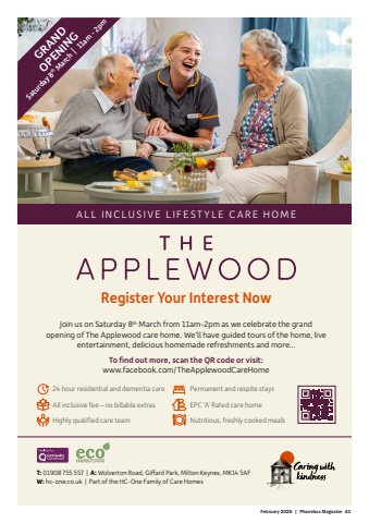 February 2025 | Phonebox Magazine 43T: 01908 755 557 | A: Wolverton Road, Giffard Park, Milton Keynes, MK14 5AFW: hc-one.co.uk | Part of the HC-One Family of Care Homes GRANDOPENING Saturday 8th March l 11am - 2pmRegister Your Interest NowJoin us on Saturday 8th March from 11am-2pm as we celebrate the grand opening of The Applewood care home. We%u2019ll have guided tours of the home, live entertainment, delicious homemade refreshments and more...To find out more, scan the QR code or visit: www.facebook.com/TheApplewoodCareHomeALL INCLUSIVE LIFESTYLE CARE HOME24 hour residential and dementia careAll inclusive fee %u2013 no billable extrasHighly qualified care teamPermanent and respite staysEPC %u2018A%u2019 Rated care homeNutritious, freshly cooked meals