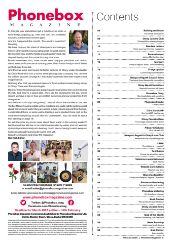 February 2025 | Phonebox Magazine 5ContentsPhonebox Magazine is owned and published by Phonebox Magazine Ltd, Unit 2, Stanley Court, Olney, Bucks MK46 5NHAdvertisers: We gratefully acknowledge the support of firms whose advertisements appear in this publication and, whilst every care is taken to ensure accuracy, the publishers regret they cannot accept responsibility for loss, damage or omission caused by error in the printing of an advertisement. Advertisements are accepted on the understanding that descriptions of goods and services are fair and accurate. All artwork is accepted on strict condition that permission has been given for use in this publication. Any reproduction of material, either advertising or editorial, is forbidden without written consent of the publishers. The publishers cannot accept responsibility for views expressed by contributors, or for the accuracy of claims made by advertisements appearing in this publication. Distribution may vary at the discretion of Phonebox Magazine Ltd.To advertise telephone (01234) 713298or email sales@phoneboxmagazine.comEmail articles and news to editorial@phoneboxmagazine.comwww.phoneboxmagazine.comTwitter: @Phonebox_magFacebook.com/PhoneboxmagDeadline for March 2025 edition - 14th FebruaryIn this job, you sometimes get a month or so when a word keeps popping up, over and over. It%u2019s unrelated sources, but the word is there again.And it%u2019s happened this month. The word in question? Flooding. We have had our fair share of downpours and deluges here in Olney and the surrounding areas for what seems like months now, and the fields around us don%u2019t look like they will be dry and firm underfoot any time soon. Roads have been shut; other routes were only just passable, and drains, dams, weirs and locks are at bursting point. I had floods firmly in mind. Water on the brain, if you like.And then we were sent some fantastic pictures of Olney under floodwater by Chris Read who runs a drone aerial photography company. You can see his brilliant pictures on page 6. I was really impressed with their majesty and magnificence.Not long after that, we received news of a flood resilience team being set up in Olney. There was that word again. Many of these flood groups are popping up in local areas near us and across the UK, and they%u2019re a good idea. They can be community-led too, which means we have a say in how we protect ourselves and our properties from rising water.And before I could say %u2018rising damp%u2019, I read all about the troubles at the new Yardley Manor housing estate where residents are, quite rightly, getting upset about the levels of water they are seeing in (yes, in) and around their homes. I understand there is some extra drainage work needed there, but in the meantime everything sounds like it%u2019s %u2018underwater%u2019. You can read all about that starting on page 16.So, will there be any more news about flood water in the coming weeks? I bet there will be. We live on an island surrounded by water, and our weather system is predominately rain-bearing. I don%u2019t see us having to wind away our hoses in a drought warning for some time yet.Stay dry everyone, and enjoy the magazine.Ron Hall, Editor06 Building resilience Flood risk increases? 08 Olney Camera Club Competition winning images 10 Readers LettersHave your say, it%u2019s your magazine 12 EntertainmentJason Manford on tour 16 Mercury Olney%u2019s regular Town Council meeting 18 Fridge update Community food initiative 22 Newport Pagnell Council NewsThe latest from Newport%u2019s councillors 24 Olney Ward CouncillorsReports from our MK team 26 Phonebox Diary Our local clubs and societies29 Phonebox Foodie Lovers unite30 Chris Curtis MP Our local MP has his say32 Olney Pancake Race Four-page pullout on the event35 Pibworth ColumnIs all ok with AI?36 Newport Pagnell & Olney Lions ClubNews from the charitable group37 CRMKTime takes a . . . snake?38 Two thorns A rose by any other name39 Valentine%u2019s entertainmentDark hearts 41 Rebuild ConnectionsTips for your love 42 Churches together Olney and Newport Pagnell Churches 44 Phonebox Gardening You say tomato, and so do I 48 Phonebox MotoringIt%u2019s time for a change50 Book Review Two books to read all about 52 Olney Ukraine News Donate for those in need53 Club of the Month Denton Gardening club featured56 News Roundup Lots more local stories 62 Quiz Corner Love puzzler