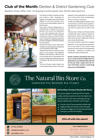 February 2025 | Phonebox Magazine 53Club of the Month: Denton & District Gardening ClubSpeakers, shows, raffl es, chat %u2013 it%u2019s all going on at this popular club. And the cake%u2019s good too.The Denton & District Gardening Club was formed in 2001. Originally the majority of members were from Denton village, but now three quarters come from the surrounding villages, Olney and Northampton. They meet in Denton Village Hall on a monthly basis, at 7.30pm on the second Monday of the month from September to June. The meetings start with any notices, then there%u2019s a visiting speaker to talk about a wide range of horticultural topics, ranging from vegetable gardening, pruning, propagation, planting and design to indoor plants. These last for about an hour, after which members can ask questions, followed by a horticulturally-themed raffl e. %u201cWe then fi nish with tea, coff ee and cake, which is very popular,%u201d says Margaret Pateman, club secretary. %u201cWe aim to go on an evening visit to a local garden and a longer outing further afi eld during July and August. We also have two shows a year.%u201dThe fi rst of these is held in March and is their Spring Flower Show. They have classes for many bulbs (both as cut fl owers and in pots) and for fl ower arrangements. There is a class for everything. %u201cIt really is an uplifting sight to see the array of various blooms, and the scent is gorgeous,%u201d says Margaret. %u201cIt is an open show, so anyone can enter and entries can be made on the day. %u201cWe also have a Flower and Produce Show in September which combines classes for baked goods, flowers and vegetables. At both events we have a raffl e, plant stall and home-made refreshments.%u201dThe club%u2019s members range from complete beginners to very experienced gardeners, but no-one needs to worry about being quizzed to fi nd the extent of their gardening knowledge %u2013 meetings are relaxed, and friendly and visitors are welcome.Denton & District Gardening Club meet once a month at Denton Village Hall from September to June. Membership costs %u00a315 for the year while a single visit is %u00a35. For more information contact: m.pateman@yahoo.co.uk, 01604 890875.One bin unit fits three individual wheelie binsHighly durable with stainless steel hardwareFeatures an elegant barrel roof with wild sedumDelivered, planted and installedBritish Made, Premium Wooden Bin StoresTidy up your garden or driveway with our locallycrafted, solid hard wood bin stores that blends intothe environment. Built with sustainably sourced,natural materials that will last for over 25 years.07706 470869sales@naturalbin.co.uknaturalbin.co.uk25% off with this advert!This is an MDBI Ltd Product: