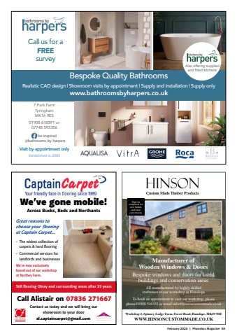 February 2025 | Phonebox Magazine 55All manufactured by highly skilled craftsmen at our workshop in Hanslope To book an appointment to visit our workshop, pleasephone 01908 516333 or email info@hinsoncustommade.co.ukWorkshop 2, Spinney Lodge Farm, Forest Road, Hanslope, MK19 7DEWWW.HINSONCUSTOMMADE.CO.UKManufacturer of Wooden Windows & DoorsBespoke windows and doors for listed buildings and conservation areasPAS 24 compliant for new builds and barn conversions%u2022 The widest collection of carpets & hard flooring%u2022 Commercial services for landlords and businessesWe%u2019re now exclusively based out of our workshop at Northey Farm.Call Alistair on 07836 271667We%u2019ve gone mobile!Across Bucks, Beds and Northantsal.captaincarpet@gmail.comContact us today and we will bring our showroom to your doorGreat reasons to choose your flooring at Captain Carpet...Still flooring Olney and surrounding areas after 35 years01908 618591 or 07748 595356Established in 2000Visit by appointment only be inspired@bathrooms-by-harpers www.bathroomsbyharpers.co.ukBespoke Quality BathroomsRealistic CAD design | Showroom visits by appointment | Supply and installation | Supply onlyCall us for a FREEsurvey be inspired7 Park FarmTyringhamMK16 9ESCMYCMMYCYCMYKBathrooms by Harpers MK Pulse advertisement 2020 V13 (120423)_hi_res.pdf 1 13/04/2023 17:16Also offering supplied and fi tted kitchens