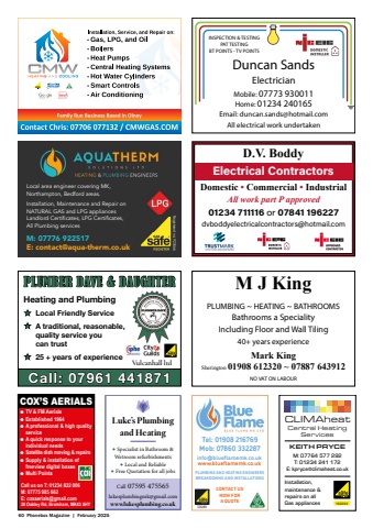 60 Phonebox Magazine | February 2025info@bluefl amemk.co.ukwww.bluefl amemk.co.ukTel: 01908 216769Mob: 07860 332287PLUMBING AND HEATING ENGINEERSBREAKDOWNS AND INSTALLATIONSCONTACT US NOW FOR A QUOTE 33089D.V. BoddyElectrical ContractorsDomestic %u2022 Commercial %u2022 IndustrialAll work part P approved01234 711116 or 07841 196227dvboddyelectricalcontractors@hotmail.comDuncan SandsElectricianMobile: 07773 930011Home: 01234 240165Email: duncan.sands@hotmail.comAll electrical work undertakenINSPECTION & TESTINGPAT TESTINGBT POINTS - TV POINTSRegistered no: 927666M: 07776 922517E: contact@aqua-therm.co.ukLocal area engineer covering MK, Northampton, Bedford areas.Installation, Maintenance and Repair on NATURAL GAS and LPG appliancesLandlord Certifi cates, LPG Certifi cates, All Plumbing services%u00ab Local Friendly Service%u00ab A traditional, reasonable, quality service you can trust%u00ab 25 + years of experienceCall: 07961 441871Vulcanhall ltd PLUMBER DAVE & DAUGHTERHeating and PlumbingCentral Heating ServicesCLIMAheat192093KEITH PRYCEM: 07764 577 292T: 01234 241 172E: kpryce@climaheat.co.ukInstallation, maintenance &repairs on all Gas appliances%u25c6 Specialist in Bathroom & Wetroom refurbishments%u25c6 Local and Reliable%u25c6 Free Quotation for all jobsLuke%u2019s Plumbing and Heatinglukesplumbingmk@gmail.comwww.lukesplumbing.co.ukCall 07595 475565COX%u2019S AERIALS%u25cf TV & FM Aerials%u25cf Established 1964%u25cf A professional & high qualityservice%u25cf A quick response to yourindividual needs%u25cf Satellite dish moving & repairs%u25cf Supply & installation offreeview digital boxes%u25cf Multi PointsCall us on T: 01234 822 006M: 07974 933 526E: coxaerials@gmail.com28 Oakley Rd, Bromham, MK43 8HYCall us on T: 01234 822 006M: 07775 985 662E: coxaerials@gmail.com28 Oakley Rd, Bromham, MK43 8HYM J KingPLUMBING ~ HEATING ~ BATHROOMSBathrooms a SpecialityIncluding Floor and Wall Tiling40+ years experienceMark KingSherington 01908 612320 ~ 07887 643912NO VAT ON LABOUR