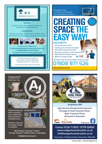 February 2025 | Phonebox Magazine 63Block Paving %u2022 Driveways %u2022 Patios %u2022 Fencing %u2022 Sleepers %u2022 Artificial Grass %u2022 Landscapinginfo@ajblockpaving.comAJ Block Paving pridesitself on paving theway in quality drives,paths and patios atcompetitive prices.We offer a full service,from design, throughto installation.07551 461 733Call now for your free,no obligation quoteAgricultural & Residential GroundworksDrainage & Flood Prevention WorksWater Treatment PlantsBrickwork & StoneworkEstablished 2009www.ovalparkconstruction.co.ukinfo@ovalparkconstruction.co.ukIncon House, 10 Stilebrook Road, Olney, Bucks. MK46 5EAfind us onContact 01234 713025 / 07770 52856901908 871 526Call Simon now to book a FREE survey & quote%u2022 De-clutter your home%u2022 Create up to a third more space%u2022 Gain safe & easy loft access%u2022 No mess, no fuss, no sub contractors%u2022 DBS checked & fully insured %u2022 Which? Trusted TraderWe supply & Install:%u2022 Loft ladders & loft hatches%u2022 Boarding, lighting & insulationCall Kelvin now to book a FREE survey & quoteAsbestos Asbestos Surveys, Sampling and Consultancy for Domestic & Commercial propertiesEnvironmentalSampling and analysis: Soil (for asbestos) & Waste-Water.We also offer expertise pertaining to Rewilding & PermacultureCovering Herts, Beds, Bucks and beyondContact us for a free quote:E: amanda.ryan@mdenvironmentalsurveys.co.ukT: 07566256060 / 07747423684W: www.mdenvironmentalsurveys.co.ukM D Environmental Surveys Ltd59 LanglandsMK46 4EPOpening Hours Mon- Fri 9am-5pmM DENVIRONMENTAL SURVEYS LTDAsbestos - Management Asbestos Surveys, Management Plans, Pre-refurbishment Asbestos Surveys, Predemolition Asbestos Surveys, Sampling Exercises or Consultancy for either Domestic or Commercial properties.Environmental - Sampling and analysis: Soil (for asbestos) & Waste-Water.We also offer expertise pertaining to Rewilding & PermacultureCovering Herts, Beds, Bucks and beyondContact us for a free quote:E: amanda.ryan@mdenvironmentalsurveys.co.ukT: 07566256060 / 07747423684W: www.mdenvironmentalsurveys.co.ukM D Environmental Surveys Ltd59 LanglandsMK46 4EPOpening Hours Mon- Fri 9am-5pmM DENVIRONMENTAL SURVEYS LTDAsbestos - Management Asbestos Surveys, Management Plans, Pre-refurbishment Asbestos Surveys, Predemolition Asbestos Surveys, Sampling Exercises or Consultancy for either Domestic or Commercial properties.Environmental - Sampling and analysis: Soil (for asbestos) & Waste-Water.We also offer expertise pertaining to Rewilding & PermacultureContact us for a free quote:E: amanda.ryan@mdenvironmentalsurveys.co.ukT: 07566256060 / 07747423684W: www.mdenvironmentalsurveys.co.ukCovering Herts, Beds, Bucks and beyondM D Environmental Surveys Ltd59 Langlands, Lavendon, MK46 4EPOpening Hours Mon- Fri 9am-5pmCovering Herts, Beds, Bucks and beyondContact us for a free quote:E: amanda.ryan@mdenvironmentalsurveys.co.ukT: 07566256060 / 07747423684W: www.mdenvironmentalsurveys.co.ukM D Environmental Surveys Ltd59 LanglandsMK46 4EPOpening Hours Mon- Fri 9am-5pmM DENVIRONMENTAL SURVEYS LTDAsbestos - Management Asbestos Surveys, Management Plans, Pre-refurbishment Asbestos Surveys, Predemolition Asbestos Surveys, Sampling Exercises or Consultancy for either Domestic or Commercial properties.Environmental - Sampling and analysis: Soil (for asbestos) & Waste-Water.We also offer expertise pertaining to Rewilding & Permaculture