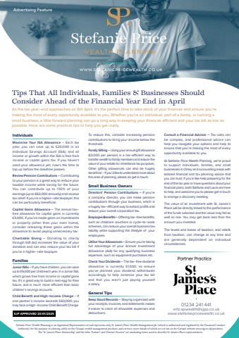 February 2025 | Phonebox Magazine 9IndividualsMaximise Your ISA Allowance %u2013 Each tax year, you can save up to %u00a320,000 in an Individual Savings Account (ISA), and all income or growth within the ISA is free from income or capital gains tax. If you haven%u2019t used your allowance yet, now%u2019s the time to top up before the deadline passes.Review Pension Contributions %u2013 Contributing to your pension is a great way to reduce your taxable income while saving for the future. You can contribute up to 100% of your earnings (up to %u00a360,000 annually) and receive tax relief. If you%u2019re a higher%u2013rate taxpayer, this can be particularly benefi cial.Capital Gains Allowance %u2013 The annual tax%u2013free allowance for capital gains is currently %u00a33,000. If you%u2019ve made gains on investments or property (other than your main home), consider releasing these gains within the allowance to avoid paying unnecessary tax.Charitable Giving %u2013 Donating to charity through Gift Aid increases the value of your donation and can also reduce your tax bill if you%u2019re a higher%u2013rate taxpayer.FamiliesJunior ISAs %u2013 If you have children, you can save up to %u00a39,000 per child each year, in a Junior ISA, which grows free from income or capital gains tax. It%u2019s a great way to build a nest egg for their future, and is much more e%u008a cient than basic children%u2019s savings accounts.Child Benefi t and High%u2013Income Charge %u2013 If one partner%u2019s income exceeds %u00a360,000, you may face a High%u2013Income Child Benefi t Charge.To reduce this, consider increasing pension contributions to bring your income below the threshold.Family Gifting %u2013 Using your annual gift allowance (%u00a33,000 per person) is a tax%u2013efficient way to transfer wealth to family members and reduce the value of your estate for inheritance tax purposes. Other gifting allowances can also be hugely benefi cial %u2013 if you%u2019d like to understand more about this area of planning, please do get in touch.Small Business OwnersDirectors%u2019 Pension Contributions %u2013 If you%u2019re a company director, you can make pension contributions through your business, which is a hugely tax%u2013e%u008a cient way to extract profi ts and reduce your overall corporation tax.Employee Benefi ts %u2013 O%u0093 ering tax%u2013free benefi ts, such as childcare vouchers or cycle%u2013to%u2013work schemes, can reduce your overall business tax liability while supporting the lifestyle of your employees.Utilise Your Allowances %u2013 Ensure you%u2019re taking full advantage of your Annual Investment Allowance (AIA) for any qualifying business expenses, such as equipment purchases etc.Check Your Dividends %u2013 The tax%u2013free dividend allowance is currently %u00a31,000, so ensure you%u2019ve planned your dividend withdrawals accordingly to help minimise your tax bill and that you aren%u2019t just paying yourself a salary.General TipsKeep Good Records %u2013 Staying organised with your receipts, invoices, and statements makes it easier to claim all allowable expenses and deductions.Consult a Financial Adviser %u2013 Tax rules can be complex, and professional advice can help you navigate your options and help to ensure that you%u2019re making the most of every opportunity available to you.At Stefanie Price Wealth Planning, we%u2019re proud to support individuals, families, and small businesses in Olney and surrounding areas with tailored fi nancial and tax planning advice that you can trust. If you%u2019d like help preparing for the end of the tax year or have questions about your fi nancial plans, both Stefanie and Laura are here to help, and welcome you to please get in touch to arrange a discovery meeting.The value of an investment with St. James%u2019s Place will be directly linked to the performance of the funds selected and the value may fall as well as rise. You may get back less than the amount you invested.The levels and bases of taxation, and reliefs from taxation, can change at any time and are generally dependent on individual circumstances.Advertising FeatureTips That All Individuals, Families & Businesses Should Consider Ahead of the Financial Year End in AprilAs the tax year%u2013end approaches on 6th April, it%u2019s the perfect time to take stock of your fi nances and ensure you%u2019re making the most of every opportunity available to you. Whether you%u2019re an individual, part of a family, or running a small business, a little forward planning can go a long way in keeping your fi nances e%u008d cient and your tax bill as low as possible. Here are some practical tips to help you get ready.www.stefaniepricewealth.co.uk%u2022 01234 241 441info.spwealth@sjpp.co.ukSJP APPROVED 20/01/2025 www.stefaniepricewealth.co.ukStefanie Price Wealth Planning is an Appointed Representative of and represents only St. James%u2019s Place Wealth Management plc (which is authorised and regulated by the Financial Conduct Authority) for the purpose of advising solely on the Group%u2019s wealth management products and services, more details of which are set out on the Group%u2019s website www.sjp.co.uk/products. fi e %u2018St. James%u2019s Place Partnership%u2019 and the titles %u2018Partner%u2019 and %u2018Partner Practice%u2019 are marketing terms used to describe St. James%u2019s Place representatives.