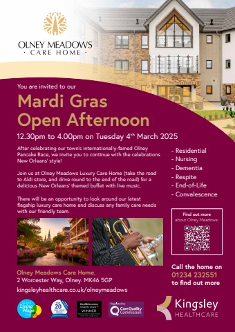 March 2025 | Phonebox Magazine 23Mardi GrasOpen AfternoonOlney Meadows Care Home, 2 Worcester Way, Olney. MK46 5GPCall the home on 01234 232551to find out morekingsleyhealthcare.co.uk/olneymeadows- Residential- Nursing - Dementia- Respite - End-of-Life - Convalescence12.30pm to 4.00pm on Tuesday 4th March 2025Find out more about Olney Meadows:You are invited to ourAfter celebrating our town%u2019s internationally-famed OlneyPancake Race, we invite you to continue with the celebrations New Orleans%u2019 style!Join us at Olney Meadows Luxury Care Home (take the roadto Aldi store, and drive round to the end of the road) for adelicious New Orleans%u2019 themed buffet with live music.There will be an opportunity to look around our latest flagship luxury care home and discuss any family care needs with our friendly team.