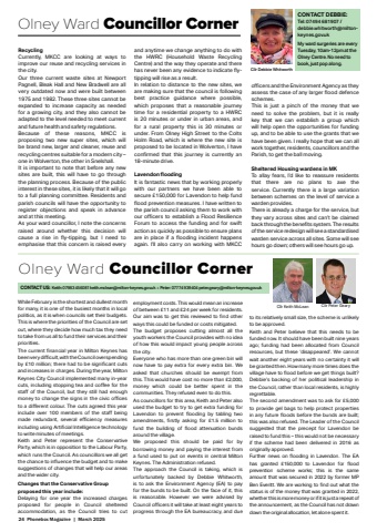 24 Phonebox Magazine | March 2025While February is the shortest and dullest month for many, it is one of the busiest months in local politics, as it is when councils set their budgets. This is where the priorities of the Council are set out, where they decide how much tax they need to take from us all to fund their services and their priorities. The current fi nancial year in Milton Keynes has been very diffi cult, with the Council overspending by %u00a310 million; there had to be signifi cant cuts and increases in charges. During the year, Milton Keynes City Council implemented many in-year cuts, including stopping tea and coff ee for the staff of the Council, but they still had enough money to change the signs in the civic offi ces to a diff erent colour. The cuts agreed this year include over 100 members of the staff being made redundant, several effi ciency measures including using Artifi cial Intelligence technology to write minutes of meetings.Keith and Peter represent the Conservative Party, which is in opposition to the Labour Party, which runs the Council. As councillors we all get the chance to infl uence the budget and to make suggestions of changes that will help our areas and the wider city. Changes that the Conservative Group proposed this year include:Delaying for one year the increased charges proposed for people in Council sheltered accommodation, as the Council tries to cut employment costs. This would mean an increase of between %u00a311 and %u00a324 per week for residents. Our aim was to get this reviewed to fi nd other ways this could be funded or costs mitigated.The budget proposes cutting almost all the youth workers the Council provides with no idea of how this would impact young people across the city.Everyone who has more than one green bin will now have to pay extra for every extra bin. We asked that churches should be exempt from this. This would have cost no more than %u00a32,000, money which could be better spent in the communities. They refused even to do this.As councillors for this area, Keith and Peter also used the budget to try to get extra funding for Lavendon to prevent fl ooding by tabling two amendments, fi rstly asking for %u00a31.5 million to fund the building of fl ood attenuation bunds around the village. We proposed this should be paid for by borrowing money and paying the interest from a fund used to put on events in central Milton Keynes. The Administration refused. The approach the Council is taking, which is unfortunately backed by Debbie Whitworth, is to ask the Environment Agency (EA) to pay for the bunds to be built. On the face of it, this is reasonable. However we were advised by Council offi cers it will take at least eight years to progress through the EA bureaucracy, and due to its relatively small size, the scheme is unlikely to be approved.Keith and Peter believe that this needs to be funded now. It should have been built nine years ago; funding had been allocated from Council resources, but these %u2018disappeared%u2019. We cannot wait another eight years with no certainty it will be granted then. How many more times does the village have to fl ood before we get things built? Debbie%u2019s backing of her political leadership in the Council, rather than local residents, is highly regrettable.The second amendment was to ask for %u00a35,000 to provide gel bags to help protect properties in any future fl oods before the bunds are built; this was also refused. The Leader of the Council suggested that the precept for Lavendon be raised to fund this %u2013 this would not be necessary if the scheme had been delivered in 2016 as originally approved.Further news on fl ooding in Lavendon. The EA has granted %u00a3150,000 to Lavendon for fl ood prevention scheme works; this is the same amount that was secured in 2022 by former MP Ben Everitt. We are working to fi nd out what the status is of the money that was granted in 2022, whether this is more money or if it is just a repeat of the announcement, as the Council has not drawn down the original allocation, let alone spent it. Olney Ward Councillor Corner CONTACT DEBBIE:Tel: 07494 681907 / debbie.whitworth@miltonkeynes.gov.ukMy ward surgeries are every Tuesday, 10am-12pm at the Olney Centre. No need to book, just pop along.Cllr Debbie WhitworthOlney Ward Councillor CornerCllr Keith McLean Cllr Peter GearyCONTACT US: Keith: 07983 456081 keith.mclean@milton-keynes.gov.uk :: Peter: 07774 939404 peter.geary@milton-keynes.gov.ukRecyclingCurrently, MKCC are looking at ways to improve our reuse and recycling services in the city.%u00a0Our three current waste sites at Newport Pagnell, Bleak Hall and New Bradwell are all very outdated now and were built between 1975 and 1982. These three sites cannot be expanded to increase capacity as needed for a growing city, and they also cannot be adapted to the level needed to meet current and future health and safety regulations.Because of these reasons, MKCC is proposing two new super sites, which will be brand new, larger and cleaner, reuse and recycling centres suitable for a modern city %u2013 one in Wolverton, the other in Snelshall.%u00a0It is important to note that before any new sites are built, this will have to go through the planning process. Because of the public interest in these sites, it is likely that it will go to a full planning committee. Residents and parish councils will have the opportunity to register objections and speak in advance and at this meeting.As your ward councillor, I note the concerns raised around whether this decision will cause a rise in fl y-tipping, but I need to emphasise that this concern is raised every and anytime we change anything to do with the HWRC (Household Waste Recycling Centre) and the way they operate and there has never been any evidence to indicate fl ytipping will rise as a result.%u00a0In relation to distance to the new sites, we are making sure that the council is following best practice guidance wher