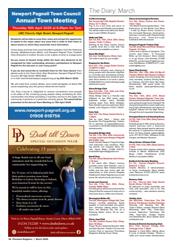 26 Phonebox Magazine | March 2025Coff ee morningsSat 1st%u00a0and Sat 15th, Baptist Church, Olney, 10-11.30amPop in for a hot drink and piece of cake%u00a0in warm and friendly surroundings. You will be made most welcome.%u00a0Donations in aid of Willen Hospice.Walk and TalkSat 1st, 8th, 15th, 22nd, 29th, Olney Centre, 10.30-11.30amStarting at the Olney Centre, there%u2019s a gentle stroll and a chat with free refreshments available on return.Open Mic NightSun 2nd, Two Brewers, Olney, 7pmThe mike is open for you tonight.Singing for the BrainMon 3rd, 17th, Lodge Guide Centre, Loughton LodgeAlzheimer%u2019s Society uses singing to bring people with dementia together in a friendly and stimulating activity. Morning and afternoon sessions available. More details or to book a place, 01908 232612 or email%u00a0miltonkeynes@alzheimers.org.uk.Olney Bridge ClubMon 3rd,10th, 17th, 24th and 31st, Olney Centre, 6.45 pmOlney Bridge Club is a friendly club affi liated to the EBU which plays duplicate bridge every Monday evening apart from Bank Holidays. New members are very welcome. More details: John Claydon, 01234 713045.Folio TalkMon 3rd, The Olney Centre Room 4, 7.30pmTalk by Jean Yates %u2013 %u2018Idiotic and Eccentric: The Things We Say%u2019. Tickets: %u00a36 in advance at%u00a0 www.ticketsource.co.uk/folio%u00a0or 0333 666 3366 (includes refreshments).Ousedale Bridge ClubTue 4th, 11th, 18th, 25th, Community Lounge, Lakes Lane, Newport Pagnell MK16 8EG, 7pmSmall friendly Newport Pagnell bridge club welcomes new members. Playing partner not required. More details: David Wells, 01908 678147,%u00a0ousedalebridgeclub@gmail.comMardi Gras Tue 4th, Olney Meadows Care Home, 1.30-4pmA fun event after Olney%u2019s famous pancake races have fi nished. Join in for a delicious New Orleans-themed buff et and live jazz music with the opportunity to look around Kingsley Healthcare%u2019s latest fl agship luxury care home. No need to book, just drop in.Come and ConnectTue 4th, 11th, 18th, 25th, Olney Centre, 10am-12pmFriendly group welcomes presented by Olney Is Kind for anyone to drop in for a chat and a tea or coff ee and a biscuit. Sherington Belles WITue 4th, Sherington Village Hall, 7pmGroup%u2019s monthly gathering. Guest speaker is local journalist and author Tom Johnston talking about: %u2018Cars, Stars and Minibars: My Life as a Motoring Writer%u2019. Entry: %u00a35 for nonmembers.Olney Jazz ClubTue 4th, Carlton House Club, Olney, 8pm-10.30pmTough Tenors, featuring Brandon Allan and Alex Garnett. Tickets %u00a315 from the Carlton Club or sponsors Phonebox Magazine, Stanley Court, Olney.The Diary: March Olney Archaeological SocietyTue 4th, Olney Centre and Zoom, 10am-12pm%u2018The World Turned Upside Down %u2013 The Experience of the British Civil Wars %u2013 a talk by Stuart Orme, Curator at the Cromwell Museum, Huntingdon, historian, formerly with Peterborough M u s e u m a n d Pe t e r b o r o u g h Cathedral.%u00a0Remote lecturer.Newport Pagnell%u00a0 Probus ClubTue 4th, Swan Revived Hotel, Newport Pagnell, 12.15pmLunch and%u00a0a variety of speakers. This month: Jean Yates %u2013 %u2018A Thousand Miles up the Amazon%u2019. More details or to go along: John Brimley, 01908 605378,%u00a0 johnbrimley37@btinternet.com, Neil Beeton, 01908 914771,%u00a0neilbeeton@sky.com.Open Film SocietyWed 5th, 12th, 19th, 26th, OU Berrill Theatre, Walton Hall Campus, 6.30pmLatest showings from the popular fi lm club, including Joyland, Driving Mum, La Chimera and Evil Does Not Exist. Membership: %u00a389, guest ticket: %u00a38. More details: www.openfi lmsociety.co.uk.Chatty CafeThu 6th, 13th, 20th, 27th, Mead Centre, Newport Pagnell, 11am-1pmAt a loose end, feel like a chat, new to the area, going through some changes? Go along and experience a warm welcome, enjoy light refreshments and plenty of laughter. Based off the High Street, through the arch opposite Superdrug.Georgian Dancers of Amazing GraceFri 7th, 14th, 21st, 28th, Olney Centre, 7-8.30 pm Friendly group of 18th-century dancers. Gentle exercise with a historical interest. New people warmly welcome. No partner or experience necessary. Entry: %u00a33. More details: walkerrd@sky.com, 07718 371554. Affi liated to the Cowper and Newton Museum.Olney Senior Citizens ClubFri 7th, 14th, 21st, 28th, Olney Centre, 2-4pmPopular social club%u2019s regular meetings include in March: Whist/Chat (7th); Bingo (14th); Chat/Games (21st); Slides of Jerusalem (28th).Bedford Art Society MeetingFri 7th, Putnoe Heights Church, Bedford, 7.15pmCharles Bezzina: A demonstration of Arctic Landscapes. More details: Jean Paterson, 01234 307210, www.bedsartsociety.co.uk.Memory Club Fri 7th, Church Hall, High Street South, Olney, 1.30-3pmAll welcome to enjoy tea/coff ee and chat, with pancakes. Join in for this social activity %u2013 new members warmly received.Yardley ArtsSat 8th/22nd, 10am-4pm, The Old School, The Square, Yardley Hastings Saturday Life Drawing; Sun 9th, 10am-4.30pm. Leaded Stained Glass Workshop; Wed 19th, 10am-2pm, Linocut Reduction Technique; Sat 29th, 10am-4pm, Collage Papers and Sketchbooks. More details: www.yardleyarts.org.Denton & District Gardening ClubMon 10th, Denton Village Hall, Vicarage Lane, 7.30pmSpeaker is Carol Bliss, talking about A Look at Garden Design%u2019. There%u2019s a raffl e and home-made refreshments. Thursday 10th April 2025 at 6.45pm for 7pmNewport Pagnell Town CouncilAnnual Town MeetingResidents will be able to voice their views and will get the opportunity to speak to the mayor about any issue that is close to their heart or about issues on which they would like more information. Come along and hear from some excellent speakers from the Historical Society, Neighbourhood Watch, and Newport Pagnell Town Football Club. Everyone is invited. Do join us for a glass of wine or orange juiceDo you know of anyone living within the town who deserves to be recognised for their outstanding voluntary contributions to Newport Pagnell for the last year or 