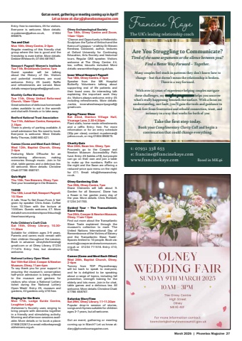 March 2025 | Phonebox Magazine 27Got an event, gathering or meeting coming up in April? Let us know at: diary@phoneboxmagazine.comEntry: free to members, %u00a35 for visitors. Everyone is welcome. More details: m.pateman@yahoo.co.uk, 01604 890875.Tea and ChatMon 10th, Olney Centre, 2-3pmRegular meeting of this friendly chat group where the tea is good and the friendship is even better. More details: Debbie Whitworth, 07494 681907.Newport Pagnell Women%u2019s InstituteTue 11th, Brooklands Centre, 7pmGuest speaker will be talking about the History of Gin. Visitors and potential members are most welcome. Entry: %u00a35 (cash). Raffl e and refreshments are served.%u00a0 More details%u00a0newportpagnellwi@gmail.com.Monthly Coff ee MorningTue 11th, Olney United Reformed Church, 10am-12pmGreat selection of delicious homemade cakes available to eat in the warmth and chat with friends or to take away.Bedford National Trust AssociationTue 11th, Addison Centre, Kempston, 2.15pmThere is plenty of parking available. A small admission fee. No need to book. Everyone is welcome. More Details: Betty Thomas, 0480 860 421.Cameo (Come and Meet Each Other)Wed 12th, Baptist Church, Olney, 2-4pmFeaturing Marie O%u2019Rourke for an entertaining afternoon, making memories through music.%u00a0 Join in for chat, table games and a delicious tea. All welcome. More details:%u00a0 Christine Chatt 07786 %u00a0658767.Quiz NightThu 13th, Two Brewers, Olney, 7pmTest your knowledge in the Brewers.TASNB Thu 13th, Lovat Hall, Newport Pagnell, 10.15amA talk: %u2018How To Get Down From A Yak%u2018 given by speaker Chris Aslan. Coff ee from 10.15am with the lecture at 10.50am. Guests welcome, %u00a37. More details from: membershipnorthbucks@theartssociety.org.Folio Children%u2019s Craft ClubSat 15th, Olney Library, 10.30-11.30amSuitable for children ages 3-9 years. Parents and carers must remain with their children throughout the session. Book in advance: olneyfoliofriends@gmail.com%u00a0 or at Olney Library, 01234 711474. Entry: free, but donations welcome. %u00a0National Lottery Open WeekSat 15th-Sat 22nd, Cowper & Newton Museum, Olney, 11am-4pmTo say thank you for your support in ensuring the museum%u2019s conservation half-price admission is being off ered to the museum and gardens for visitors who show a National Lottery ticket during the %u2018National Lottery Open Week%u2019. Entry: %u00a35, museum and gardens, %u00a32 gardens only, U16 free.Singing for the BrainMon 17th, Lodge Guide Centre, Loughton LodgeAlzheimer%u2019s Society uses singing to bring people with dementia together in a friendly and stimulating activity. Morning and afternoon sessions available. More details or to book a place: 01908 232612 or email:%u00a0miltonkeynes@alzheimers.org.uk.Olney Archaeological SocietyTue 18th, Olney Centre and Zoom, 10am-12pm%u2018Chance and Opportunity in Hellenistic Sculpture: the Tyche of Antioch and the Kairos of Lysippus%u00a0%u2013 a talk by Dr Steven Kershaw, Classicist, author, lectures at Oxford University for Continuing Education, Arts Society and historical tours. Regular OAS speaker. Visitors welcome at The Olney Centre: %u00a34, tea, coff ee, biscuits included. More details:%u00a0www.mkheritage.org.uk/oas.Inner Wheel Newport PagnellTue 18th, Olney Centre, 2-4pmSpeaker from the MK Hospital Butterfl y Volunteers talking about supporting end of life patients and their loved ones. An interesting talk explaining the important work they do. Visitors always welcome, entry: %u00a35 including refreshments. More details: Jackie, innerwheelnewportpagnell@gmail.com.Spring Flower ShowSat 22nd, Denton Village Hall, Vicarage Lane, 2.30-4.30pmPlant stalls, home-made refreshments and a raffl e. Entry: free. For more information or for an entry schedule (30p per class), contact%u00a0 m.pateman@yahoo.co.uk, or ring 01604 890875.Charity QuizMon 24th, Swan Inn, Olney, 7pmProceeds go to the Cowper and Newton Museum Accessibility%u00a0 Path fund. Entry: %u00a35%u00a0(tables of 8), but people can go on their own and join a table to make up the numbers. Raffl e on the night and the Swan are off ering a reduced-price quiz menu on the night for%u00a0 %u00a311. Email: info@theswanolney.co.uk.Olney Gardening ClubTue 25th, Olney Centre, 7pmDiane Clements will talk about %u2018A Garden for all Seasons%u2019. Diane has a fl ower in her garden every day of the year. More details: Chris Richbell, 01234 241700.Guided Tour %u2013 The Transatlantic Slave TradeTue 25th, Cowper & Newton Museum, Olney, 11am-12pmFind out more about the Transatlantic Slave Trade explained through the museum%u2019s collection to mark %u2018The United Nations International Day of Remembrance of the Victims of Slavery and the Transatlantic Slave Trade%u2019. Spaces limited to 10 people. Book via: events@cowperandnewtonmuseum.org.uk or 01234 711516. Entry: %u00a310, U16 free.Cameo (Come and Meet Each Other)Wed 26th, Baptist Church, Olney, 2-4pmTommy from TOP Physiotherapy will be back to speak to everyone, and he is delighted to be speaking about a range of topics, including fall prevention, strength training for the elderly and lots more. Join in for chat, table games and a delicious tea. All welcome. More details:%u00a0Christine Chatt 07786 %u00a0658767.Saturday StoryTimeSat 29th, Olney Library, 11-11.30amPopular drop-in session of stories, songs and rhymes suitable for children ages 3-7 years, but all welcome.Got an event, gathering or meeting coming up in March? Let us know at: diary@phoneboxmagazine.com.The UK%u2019s leading relationship coachBased in MK46t: 07931 338 653e: francine@francinekaye.comwww.francinekaye.comFrancine KayeAre You Struggling to Communicate?Tired of the same arguments or the silence between you?Find a Be%u0007 er Way Forward %u2013 Together.Many couples feel stuck in pa%u0007 erns they don%u2019t know how to change %u2013 but that doesn%u2019t mean the relationship is broken. There is a way forward.With over 25 years of experience helping couples