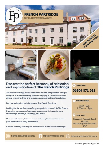 March 2025 | Phonebox Magazine 29Discover the perfect harmony of relaxationand sophistication at The French PartridgeBOOK NOWOPENING TIMESFIND US AT01604 871 261Mon - Sun7:30am - 11pmNewport Pagnell Road,Horton,Northamptonshire NN72APTHEFRENCHPARTRIDGEHOTEL FRENCHPARTRIDGEHOTEL FRENCHPARTRIDGEHOTEL.CO.UKThe French Partridge Hotel, restaurant, bar and spa provide a tranquilescape in a charming setting. Whether enjoying a luxurious stay, finedining, a relaxing drink, or a spa day. every moment is unforgettable.Discover relaxation and elegance at The French PartridgeLooking for the perfect venue for your special occasions? At The FrenchPartridge, we create unforgettable experiences for baby showers,christenings, birthdays, weddings, and more!Our versatile space, delicious menu, and exceptional service ensureyour celebration is truly memorable.Contact us today to plan your perfect event at The French Partridge!FRENCH PARTRIDGENEW WEBSITELAUNCHING SOON!Hotel, Restaurant, Bar & Spa