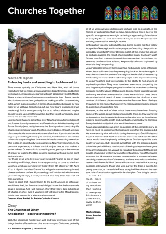 42 Phonebox Magazine | March 2025Newport PagnellEmbracing Lent %u2013 and something to look forward to!Time moves quickly on. Christmas and New Year, with all those resolutions that we made, are now an almost distant memory, and before we know it, Lent is upon us, starting with Ash Wednesday on 5th March. There is the tradition of giving up something for Lent. Some people who don%u2019t want to let Lent go by without making an eff ort do something extra, which is also an option. It comes at a good time, because by now many of us will have forgotten about our New Year%u2019s resolutions (if we made any). So it%u2019s an opportunity for us to refl ect a little and maybe decide to give up something we like, but that is not particularly good for us, like sweets or alcohol. Lent certainly has one advantage over New Year resolutions: it doesn%u2019t last forever but only seven and a half weeks from Ash Wednesday until Easter Sunday (less, really, because the Sundays don%u2019t count). Any life changes are temporary and, therefore, more doable, although we may, of course, decide to continue with them after Lent. If you should decide to give up something, there is quite a choice, from traditional chocolates or biscuits to spending less time on social media or watching television. This is also an opportunity to resuscitate a New Year resolution. In my personal experience, it is best to stick to just one, as that makes it easier to keep. Or we could do something extra, perhaps a few minutes of prayer or reading the Bible or some spiritual writing at some point during the day.For those of us who live in or near Newport Pagnell or are in town at midday on Fridays, there is the opportunity to come to the Lent Lunches, which are served every Friday from 7th March to 11th April, 12 to 1.15pm in the Mead Centre. You will get home-made soup, bread, cheese and tea or coff ee. All proceeds go to Christian Aid, which means you will not just enjoy a lovely lunch but also help those less well-off than ourselves. I have to admit that I haven%u2019t been to the Lent Lunches as often as I would have liked, but from the times I did go, I know that the home-made soup is delicious. And I will make an eff ort this year to take advantage of what is on off er. And if you have not yet been to the Mead Centre, this is your chance for a visit and a look round.Deacon Klaus Reidel, St Bede%u2019s Catholic ChurchOlneyThe Churches of OlneyAnticipation %u2013 positive or negative?Well, the Christmas holidays are well and truly over now. One of the things that has aff ected most of us in the run-up to Christmas, probably all of us when we were children and perhaps less so as adults, is the feeling of anticipation that we have. Sometimes this is due to the specifi c arrangements we might be having %u2013 a gathering of the clan or an away trip for us %u2013 and sometimes it may be due to the prospect of exciting presents that we might receive.%u2018Anticipation%u2019 is a very individual feeling. Some people may feel totally incapable of keeping it within %u2013 the prospect of watching Liverpool in an incredibly important Premier Division match at the end of the season or perhaps awaiting the result of an important exam. %u2018I just can%u2019t wait!%u2019 Others may fi nd it almost impossible to get excited by anything but seem to, on the surface at least, keep totally calm and unphased by what it is they%u2019re expecting.Jesus%u2019 disciples between them must have harboured a range of feelings when Jesus told them that they were going back to Jerusalem again. It was clear to them that some of the religious leaders felt threatened by him but they knew also that most of the people in the city loved listening to Jesus%u2019 teaching and were amazed by his ability to heal anyone of any health problem. They must have been even more pumped by the amazing reception the people gave him when he rode down to the city entrance from the Mount of Olives on a donkey. There was total uproar, and many were keen to ensure that others were told that it was Jesus whom they had all heard of, even those visiting the city from a vast number of diff erent places to celebrate the Passover Feast. Perhaps this would be the moment when even the religious leaders came around to a position of supporting him.However, at the back of their minds there must have been fl oating some of the words Jesus had pronounced to them as they journeyed to Jerusalem: that he would be betrayed, handed over to the religious leaders, sentenced to death and eventually crucifi ed by the Romans. Surely he didn%u2019t really think that would be the outcome!As we approach Easter, we are in possession of the complete story, so have no need to experience the highs and lows that the disciples did. We know exactly what will unfold during the run-up to Good Friday and beyond. We know that death on a Roman cross was not the end but that Jesus would rise triumphantly to life again as God accepted his son%u2019s death for our sins. But I can still sympathise with the disciples during this whole period. What a hotch-potch of feelings they must have gone through! Perhaps, like me, you will be rereading the account of those last couple of weeks as written by four diff erent authors. Two of them were amongst the 12 disciples; one was most probably a teenager who was certainly present at a lot of the events, and one was a doctor who had researched the whole life of Jesus with the most methodical accuracy possible, interviewing those who were part of the train of events. I%u2019m pretty sure that, as I reread the Easter story, I will be taken on the seesaw ride of anticipation again with the disciples. One thing is certain %u2013 it will be much more of a draw on my emotions than waiting to unwrap my C h r i s t m a s p r e s e n t s , lovely as they were!Martyn Glass, Olney Baptist ChurchChurches Together