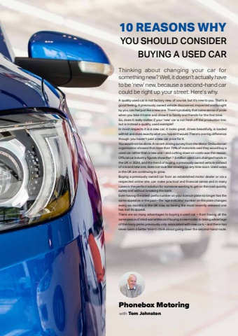 48 Phonebox Magazine | March 2025Phonebox Motoringwith Tom JohnstonA quality used car is not factory new, of course, but it%u2019s new to you. That%u2019s a good feeling. A previously owned vehicle discovered, inspected and bought by you, can feel just like a new one. There%u2019s probably that same sense of pride when you take it home and show it to family and friends for the fi rst time.So, does it really matter if your %u2018new%u2019 car is not fresh off the production line, but is instead a quality, used example?In most respects it is a new car; it looks great, drives beautifully, is loaded with kit and does exactly what you hoped it would. There%u2019s one big diff erence though: you haven%u2019t paid a new car price for it.You would not be alone. A recent driving survey from the Motor Ombudsman organisation showed that more than 70% of motorists said they would buy a used car rather than a new one %u2013 and cutting down on costs was the reason. Offi cial car industry fi gures show that 7.5 million used cars changed hands in the UK in 2024, and the trend of buying a previously owned vehicle instead of a brand new one, does not look like slowing up any time soon. Used sales in the UK are continuing to grow.Buying a previously owned car from an established motor dealer or via a respected online site, can make practical and fi nancial sense and in many cases is the perfect solution for someone wanting to get on the road quickly, safely and without breaking the bank.Even having the latest prefi x number on your licence plate no longer has the same appeal as in the past %u2013 the %u2018age indicator%u2019 number on the plate changes every six months in the UK now, so having the most recently released one has lost its appeal. There are so many advantages to buying a used car %u2013 from having all the same peace of mind warranties as if buying a new model, to taking advantage of the many perks previously only associated with new cars %u2013 and there has never been a better time to think about going down the second-hand route.Thinking about changing your car for something new? Well, it doesn%u2019t actually have to be %u2018new%u2019 new, because a second-hand car could be right up your street. Here%u2019s why.10 REASONS WHY YOU SHOULD CONSIDER BUYING A USED CAR