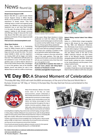 56 Phonebox Magazine | March 2025Breast Cancer Support in MKBosom Pals MK are a peer-to-peer Breast Cancer Support Group in Milton Keynes wholly run by volunteers who have personal experience of breast cancer. They hold meetings twice a month and organise group events, too. Whether you are going through treatment now or you have been through it in the past, the group will listen and off er support, helping to talk through concerns and off ering a range of resources that could help. Bosom Pals MK is also open to carers, relatives and friends of those diagnosed with Breast Cancer.Find out more: www.bosompalsmk.co.ukOlney Open GardensOlney Open Gardens is a fundraising event for Willen Hospice and is a weekend celebration of the very best gardens, both large and small, around the town. The event raised %u00a38,000 in 2023, and the organisers are hoping 2025 will be bigger and better than ever. The celebrations will take place on the weekend of June 14/15 with at least 15 gardens open, as well as Morris dancers in front of the Carlton House Club, champagne in one of the gardens, teas at the Sutcliff e Baptist church and plants for sale in the Market Place as well as a raffl e on both days Saloni: Rising musical talent from Milton KeynesSaloni is a British-Asian singer-songwriter based in MK, known for her unique blend of Pop, R&B, and Bollywood infl uences. She eff ortlessly fuses Eastern and Western sounds while singing in 10 languages.Saloni%u2019s talent has recently been recognised: she won Music Artist of the Year at the HSBC%u2019s Ethnicity Awards and Best Urban Artist at the Bhangra Awards, nominated alongside global icons like ZAYN, RAYE, and Emeli Sand%u00e9, making her wins a testament to her rising infl uence and the power of her unique musical fusion.In Saloni%u2019s words: %u201cThis year has been incredible. It feels like so much has happened that it%u2019s hard to believe it all fi t into one year! of the event. Olney Open Gardens is being publicised on both the Olney and Willen Hospice social media pages as well as locally on posters and by leafl et drops. It%u2019s going to be one of those great Olney weekends!The organising team are seeking sponsorship for this event with two packages available:%u2022 %u00a375 buys your company a position in the list of sponsors which will include logos.%u2022 %u00a3150 buys a space in the area around the map of the open gardens. This map also doubles as the ticket, so everyone attending will see your business every time they look up a new garden to visit.If you would like to sponsor the event, or fi nd out more, please visit Olney-OpenGardens on Facebook or email marihelen.esam@willen-hospice.org.ukMK rising star SaloniNews Round UpMuseum Garden Path fundraiserVE Day 80:A Shared Moment of CelebrationThursday 8th May 2025 will mark the 80th anniversary of the end of the Second World War in Europe, known as %u2018VE%u2019 Day, or %u2018Victory In Europe Day: the day German forces surrendered to the Allied powers.When Prime Minister, Winston Churchill, broke news of VE Day via radio announcement, people celebrated in their streets and homes across the UK. To celebrate this momentum occasion eighty years later, local communities across the nation are being encouraged to hold events and parties throughout the day in streets, churches, gardens, villages, town halls, pubs, clubs and hotels. Look out for further news as more events are fi nalised including Beacon lighting, fl ag ceremonies and bell ringing, amongst others.In Olney, Mayor Debbie Whitworth has joined forces with the Royal British Legion to host a party at the Carlton House Club from 2-5pm on Thursday 8th May, with a buff et, raffl e prizes and musical entertainment on off er. Tickets cost %u00a310 each and are available from The Phonebox. All proceeds will go to RBL to help those in need within the Armed Forces community; serving and ex-serving personnel and their families.If any local businesses would be willing to donate a prize for this special event, please contact Debbie Whitworth on 07949 681907.For futher information on national celebrations and planned events, visit www.veday80.org.ukVE-DAY