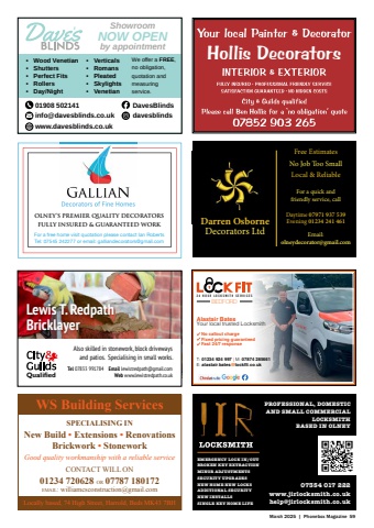March 2025 | Phonebox Magazine 59Darren OsborneDecorators LtdFree EstimatesNo Job Too SmallLocal & ReliableFor a quick and friendly service, callDaytime 07971 937 539Evening 01234 241 461Email: olneydecorator@gmail.comHollis DecoratorsOlney%u2019s Premier Quality DecoratorsFully Insured & Guaranteed WorkFor a free home visit quotation please contact Ian RobertsTel: 07545 242277 or email: galliandecorators@gmail.comShowroom NOW OPENby appointment%u2022 Wood Venetian%u2022 Shutters%u2022 Perfect Fits%u2022 Rollers%u2022 Day/Night01908 502141info@davesblinds.co.ukwww.davesblinds.co.ukDavesBlindsdavesblinds%u2022 Verticals%u2022 Romans%u2022 Pleated%u2022 Skylights%u2022 VenetianWe offer a FREE, no obligation, quotation and measuring service.%u2019WS Building ServicesSPECIALISING INNew Build %u2022 Extensions %u2022 RenovationsBrickwork %u2022 StoneworkGood quality workmanship with a reliable serviceCONTACT WILL ON01234 720628 OR 07787 180172email: williamcsconstruction@gmail.comLocally based, 74 High Street, Harrold, Beds MK43 7BHLewis T. RedpathBricklayerAlso skilled in stonework, block driveways and patios. Specialising in small works.Tel 07833 991784 Email lewistredpath@gmail.comQualified Web www.lewistredpath.co.uk24 HOUR LOCKSMITH SERVICESBEDFORDAlastair BatesYour local trusted LocksmithT: 01234 924 997 | M: 07874 285661E: alastair.bates@lockfit.co.ukNo callout chargeFixed pricing guaranteedFast 24/7 responsePROFESSIONAL, DOMESTIC AND SMALL COMMERCIAL LOCKSMITHBASED IN OLNEY07354 017 222www.jirlocksmith.co.ukhelp@jirlocksmith.co.ukEMERGENCY LOCK IN/OUTBROKEN KEY EXTRACTIONMINOR ADJUSTMENTSSECURITY UPGRADESNEW HOME NEW LOCKSADDITIONAL SECURITYNEW INSTALLSSINGLE KEY HOME LIFE