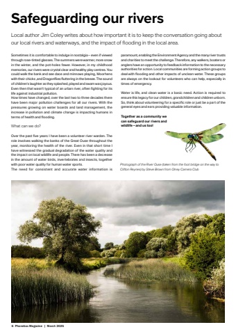 6 Phonebox Magazine | March 2025Safeguarding our riversSometimes it is comfortable to indulge in nostalgia %u2013 even if viewed through rose-tinted glasses. The summers were warmer, more snow in the winter, and the pot-holes fewer. However, in my childhood memories, our rivers were crystal clear and healthy play centres. You could walk the bank and see dace and minnows playing, Moorhens with their chicks ,and Dragonfl ies fl uttering in the breeze. The sound of children%u2019s laughter as they splashed, played and swam was joyous.Even then that wasn%u2019t typical of an urban river, often fi ghting for its life against industrial pollution. How times have changed, over the last two to three decades there have been major pollution challenges for all our rivers. With the pressures growing on water boards and land management, the increase in pollution and climate change is impacting humans in terms of health and fl ooding.What can we do?Over the past fi ve years I have been a volunteer river warden. The role involves walking the banks of the Great Ouse throughout the year, monitoring the health of the river. Even in that short time I have witnessed the gradual degradation of the water quality and the impact on local wildlife and people. There has been a decrease in the amount of water birds, invertebrates and insects, together with poor water quality for human water sports.The need for consistent and accurate water information is paramount, enabling the Environment Agency and the many river trusts and charities to meet the challenge. Therefore, any walkers, boaters or anglers have an opportunity to feedback information to the necessary authorities for action. Local communities are forming action groups to deal with fl ooding and other impacts of unclean water. These groups are always on the lookout for volunteers who can help, especially in times of emergency.Water is life, and clean water is a basic need. Action is required to ensure this legacy for our children, grandchildren and children unborn. So, think about volunteering for a specifi c role or just be a part of the general eyes and ears providing valuable information.Together as a community we can safeguard our rivers and wildlife %u2013 and us too!Local author Jim Coley writes about how important it is to keep the conversation going about our local rivers and waterways, and the impact of fl ooding in the local area.Photograph of the River Ouse (taken from the foot bridge on the way to Clifton Reynes) by Steve Brown from Olney Camera Club