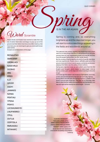 62 Phonebox Magazine | March 2025QUIZ CORNERThis welcome new season signifi es new beginnings and a fresh start for so many things. Months of cold temperatures and rainy periods have not only suppressed growth and new life, but they have left people feeling down, too (the %u2018winter blues%u2019). But the coming of Spring signifi es the birth of new life, new ideas and new experiences: fl owers bloom, daff odils peek out of the ground, trees start to bud, insects appear, and lambs can be seen playing in the fi elds near the safety of their mothers. Spring was originally known as Lent, which came from the Old English word %u2018lengten%u2019, which means %u2018to make longer%u2019. And as Spring comes upon us the days are indeed starting to become longer. Centuries ago the season was known as %u2018Springtime%u2019, but it has, in time, become shortened to the term we use today, %u2018Spring%u2019. During March we will have the Spring Equinox, a marker in the Earth%u2019s annual orbit of the Sun. This year it%u2019s on Thursday 20th March, when the Sun will be shining directly over the equator, and day and night will be exactly the same length %u2013 12 hours.IS IN THE AIR AGAIN!Spring is coming and, as everything brightens up and the days last longer, you will start to notice new things appearing in the fi elds and woodlands around us. Word ScrambleThese shrubs and fl owers have started to make their way out of winter hibernation and begun to pop up out of the ground, but their letters have become a little mixed up. See how many you can rearrange to give you some well-known plant names. Answers are at the bottom of the page.RICNAATNO SMROERIP GRDMLAOI NAEEVRLD DICRHO IIRS ERSO ILLY OPYPP ASDYI JAIMNES NZINIA PENTIAU YPSNA PENYO LECSHUNKEYO LNUFWSREO ITPUL OVTLIE ODFFDILA RMNAIGEU INTHHAYC Answers:CARNATION PRIMROSE MARIGOLD LAVENDER ORCHID IRIS ROSE LILY POPPY DAISY JASMINE ZINNIA PETUNIA PANSY PEONY HONEYSUCKLE SUNFLOWER TULIP VIOLET DAFFODIL GERANIUM HYACINTH