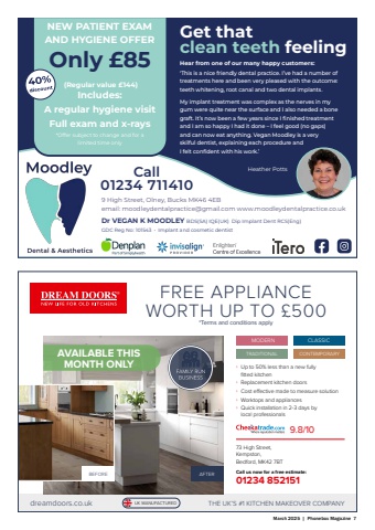 March 2025 | Phonebox Magazine 79 High Street, Olney, Bucks MK46 4EBemail: moodleydentalpractice@gmail.com www.moodleydentalpractice.co.ukDr VEGAN K MOODLEY BDS(SA) IQE(UK) Dip Implant Dent RCS(Eng) GDC Reg No: 101543 %u2022 Implant and cosmetic dentistGet that clean teeth feeling Includes:A regular hygiene visitFull exam and x-rays (Regular value %u00a3144)*Offer subject to change and for a limited time onlyHear from one of our many happy customers: %u2018This is a nice friendly dental practice. I%u2019ve had a number of treatments here and been very pleased with the outcome: teeth whitening, root canal and two dental implants. My implant treatment was complex as the nerves in my gum were quite near the surface and I also needed a bone graft. It%u2019s now been a few years since I finished treatment and I am so happy I had it done %u2013 I feel good (no gaps) and can now eat anything. Vegan Moodley is a very skilful dentist, explaining each procedure and I felt confident with his work.%u2019 Heather Potts Call 01234 711410Only %u00a385NEW PATIENT EXAMAND HYGIENE OFFERdreamdoors.co.uk THE UK%u2019S #1 KITCHEN MAKEOVER COMPANYBEFOREAVAILABLE THIS MONTH ONLYMODERN CLASSICTRADITIONAL CONTEMPORARYAFTERUK MANUFACTURED%u203a Up to 50% less than a new fully fitted kitchen%u203a Replacement kitchen doors%u203a Cost effective made to measure solution%u203a Worktops and appliances%u203a Quick installation in 2-3 days by local professionals73 High Street,Kempston,Bedford, MK42 7BTCall us now for a free estimate:01234 8521519.8/10FREE APPLIANCE WORTH UP TO %u00a3500*Terms and conditions apply