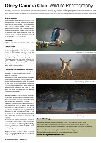 8 Phonebox Magazine | March 2025Olney Camera Club: Wildlife PhotographyKingfi sher by Duncan WoodheadRecently, we received an illustrated talk: %u2018My Photographic Journey%u2019 by amateur wildlife photographer Duncan Woodhead from Sharnbrook. Duncan has always been into wildlife, especially birds, and after he retired fi ve years ago, he decided to take up photography.Next Meetings:www.olneycameraclub.co.ukShutter speed:particularly important with bird photography, where animals are often moving fast as well. Some images might forgive a little movement in the primary feathers and tail, while the head and body remain sharp. The activity of the bird is happening extremely quickly, and you%u2019ve got to be on the ball in terms of settings to get the optimum result %u2013 whatever the optimum result is %u2013 that is often a personal choice.Focusing:get the eyes in focus %u2013 we are drawn to the eyes.Composition:he learnt early in his photographic development to take images on the same eye-line as the animal. He thinks that the closer you are to the eye line, the better perspective of that animal or bird you will get and the better photograph.That may mean that you need to lie on the ground to take the shot. This way you will also get a better blur in front and behind the subject, which will further emphasise it.Positioning of the subject is important:for example, if the animal or bird is moving, try to position it in the frame with some %u2018empty space%u2019 to move into.Surprisingly, Duncan does not favour close-ups of his subjects, preferring a full-fi gure image.As his wildlife photography skills developed, he started to be choosier about the picture foreground and background %u2013 not a technique you can use on every shot. Still, if you do, it will result in a better image, he says (for example more neutral, less busy).He likes to seek out specifi c animal activities: for example, with some planning he achieved the shot of the testosterone-fuelled rutting Red Deer, shown here at Woburn in October. Dreaming of photographing Kingfishers, you fi rst need a plan. Scout an area of river where the birds frequent, then fi nd a good place to set up a %u2018perch%u2019 %u2013 put a branch on a support the bird will %u2018fi sh%u2019 from. Now sit patiently and wait for the decisive moment. The bokeh and side lighting in the Kingfi sher image shown here were not arbitrary. Duncan describes boxing hares as an incredible spectacle to witness, let alone photograph. The hares shown here were boxing intermittently for nearly an hour; he left them with the male unwilling to give up.We thank Duncan for his excellent projected images, bringing them to life with his backstories and very useful technique advice.Brown Hares by Duncan WoodheadRed Deer by Duncan WoodheadFor further information call Andy Tel. 01234 714570; or info@olneycameraclub.co.ukWednesday 26th March: Club Competition, round 1. Starts 8pm at Olney Centre.Wednesday 30th April: Practical Session: Long Exposure. Starts 8pm at Olney Centre.Wednesday 28th May: Inter-club Competition. Towcester v Olney. Starts 8pm at Towcester.See our %u2018gallery%u2019 and check further meeting details on our website: