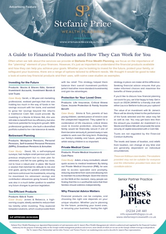 March 2025 | Phonebox Magazine 9Investing for the Future Products: Stocks & Shares ISAs, General Investment Accounts, Investment Bonds & Unit Trusts Case Study: Sarah, a 38-year-old marketing professional, realised perhaps that she was holding too much in the way of funds in her savings account with her bank, and wanted to grow her savings beyond the returns a traditional Cash ISA could provide. By investing in a Stocks & Shares ISA, she was still able to benefi t from tax eff ciency but also had more potential for long term growth. With professional guidance, she built a diversifi ed portfolio suited to her risk tolerance & needs. Retirement Planning Products: Workplace Pensions, Personal Pensions, Self-Invested Personal Pensions (SIPPs), Drawdown Pensions & Annuities Case Study: David, 55, a self-employed surveyor, had multiple small pension pots from previous employment but no clear plan for retirement, and felt he was getting too close, not to have a robust plan in place. We found a solution that matched his attitude to risk and end goals, giving him greater understanding and more control over his investments, ensuring he maximised his retirement savings and contribution allowances going forward. David was also in a much better position to weather any future changes to pension legislation.Tax-Efi cient Products Products: ISAs & TrustsCase Study: James & Rebecca, a highearning couple, ideally wanted to reduce their tax liability while investing. They explored bespoke solutions, which could provide them with tax relief. This strategy helped them balance their overall investment portfolio (which had other more standard investments) and gain tax advantages. Protection for Your Loved Ones Products: Life Insurance, Critical Illness Cover, Income Protection & Family Income Benefi tCase Study: Emma & Tom, parents of two young children, wanted peace of mind in case the unexpected happened. They opted for a combination of life insurance, critical illness cover & income protection, ensuring their family would be fi nancially secure if one of them became seriously ill, passed away or was unable to work over the long term. Protecting our family%u2019s stability and future, particularly whilst raising children is so important. Private Medical CoverProducts: Private Medical Insurance & Cash Plans Case Study: Adam, a busy consultant, valued quick access to medical treatment. By taking out Private Medical Insurance (PMI), he was able to access specialist care promptly, reducing downtime from work and allowing him to maintain his active lifestyle. Given the strains on the NHS at the moment, many people are fi nding that this is a worthwhile extra that their families should address independently. Why Financial Advice Matters Financial products can be complex, and choosing the right one depends on your unique situation. Whether you%u2019re planning for the future, protecting your loved ones, or securing your business, having the right strategy in place can make all the diffl erence. Seeking fi nancial advice ensures that you make informed choices and maximise the benefi ts of these products. If you%u2019d like to discuss how fi nancial planning can work for you, we%u2019d be happy to help. Get in touch on 01234 241441 for a friendly chat with either Laura or Stefanie to discuss your options!The value of an investment with St. James%u2019s Place will be directly linked to the performance of the funds selected and the value may fall as well as rise. You may get back less than the amount you invested. An investment in a Stocks and Shares ISA will not provide the same security of capital associated with a Cash ISA.Trusts are not regulated by the Financial Conduct Authority.The levels and bases of taxation, and reliefs from taxation, can change at any time and are generally dependent on individual circumstances.These are fi ctitious case studies. The solutions provided may not be suitable for everyone and the information provided here does not constitute advice.Advertising FeatureA Guide to Financial Products and How They Can Work for YouOften when we talk about the services we provide at Stefanie Price Wealth Planning, we focus on the importance of the %u201cplanning%u201d element of your fi nances. However, it%u2019s just as important to understand the fi nancial products available and how they can help you achieve your goals. Whether you%u2019re looking to invest for the future, protect your family, or safeguard your business, there are a range of options tailored to diff erent needs. We thought it would be good to take a look at some key fi nancial products and their uses, with some case studies as examples. www.stefaniepricewealth.co.uk%u2022 01234 241 441info.spwealth@sjpp.co.ukSJP APPROVED 20/02/2025 www.stefaniepricewealth.co.ukStefanie Price Wealth Planning is an Appointed Representative of and represents only St. James%u2019s Place Wealth Management plc (which is authorised and regulated by the Financial Conduct Authority) for the purpose of advising solely on the Group%u2019s wealth management products and services, more details of which are set out on the Group%u2019s website www.sjp.co.uk/products. fi e %u2018St. James%u2019s Place Partnership%u2019 and the titles %u2018Partner%u2019 and %u2018Partner Practice%u2019 are marketing terms used to describe St. James%u2019s Place representatives.